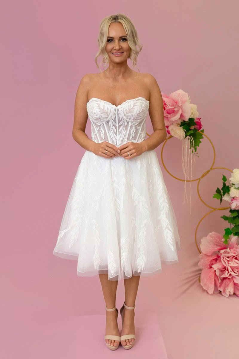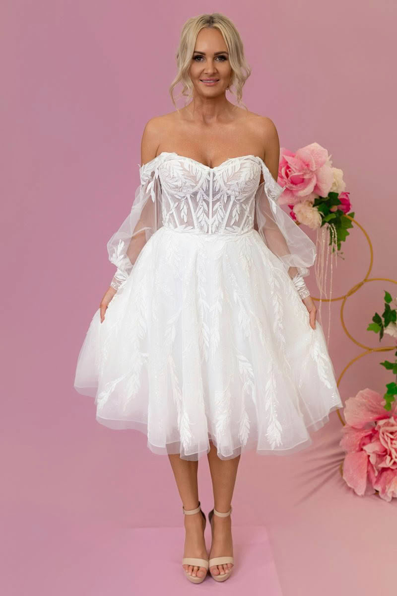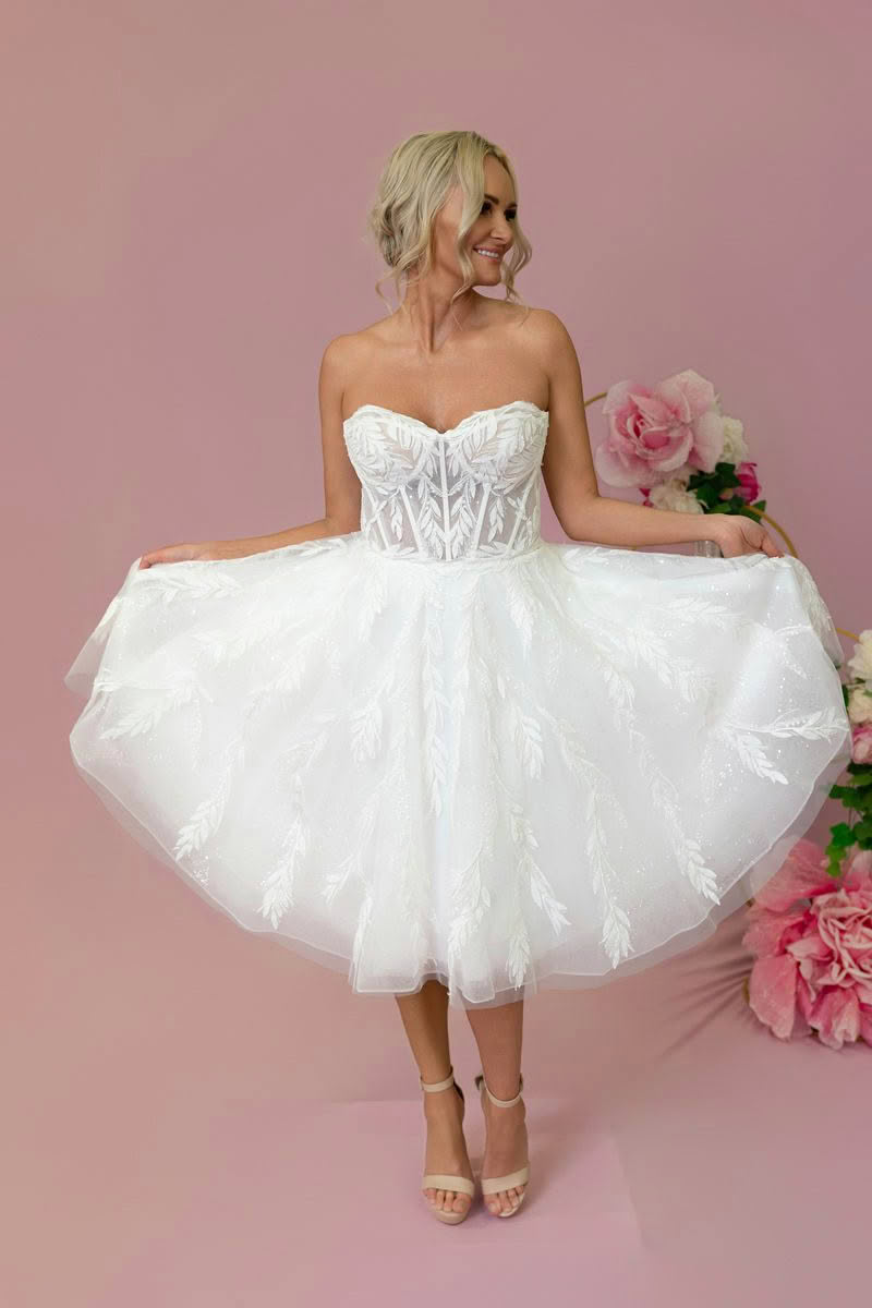 Playful yet undeniably romantic, this tea-length mini gown is perfect for the modern bride or celebration queen. Featuring a structured corset bodice with embroidered leaf lace, a soft A-line tulle skirt, and detachable sheer off-the-shoulder sleeves, it’s the ultimate party-ready bridal look. ✨
