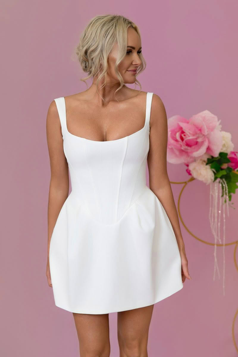 Meet Eloped in Style, the ultimate modern mini for the bride who does things her way. Crafted from structured crepe, this chic dress features a flattering scoop neckline, corseted bodice, and softly flared skirt that moves effortlessly. Understated yet striking, it’s perfect for courthouse vows, destination weddings, or the after-party look of dreams. 🤍