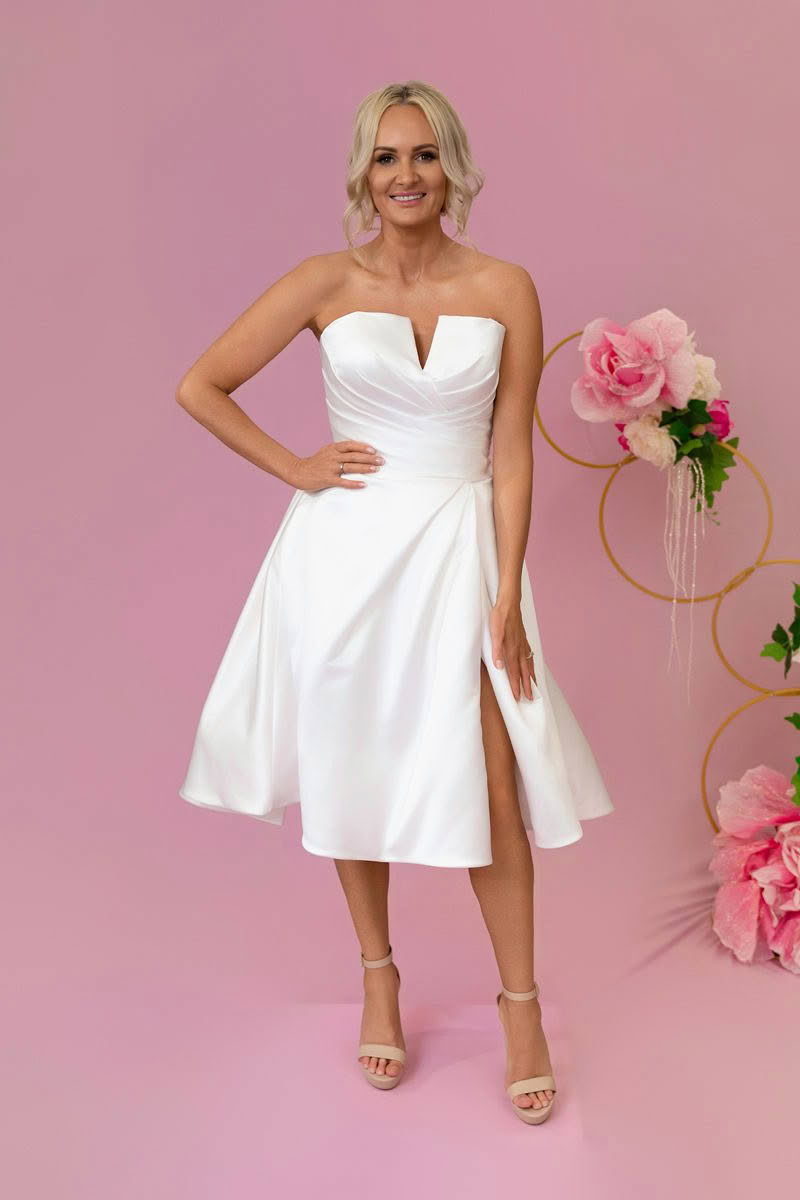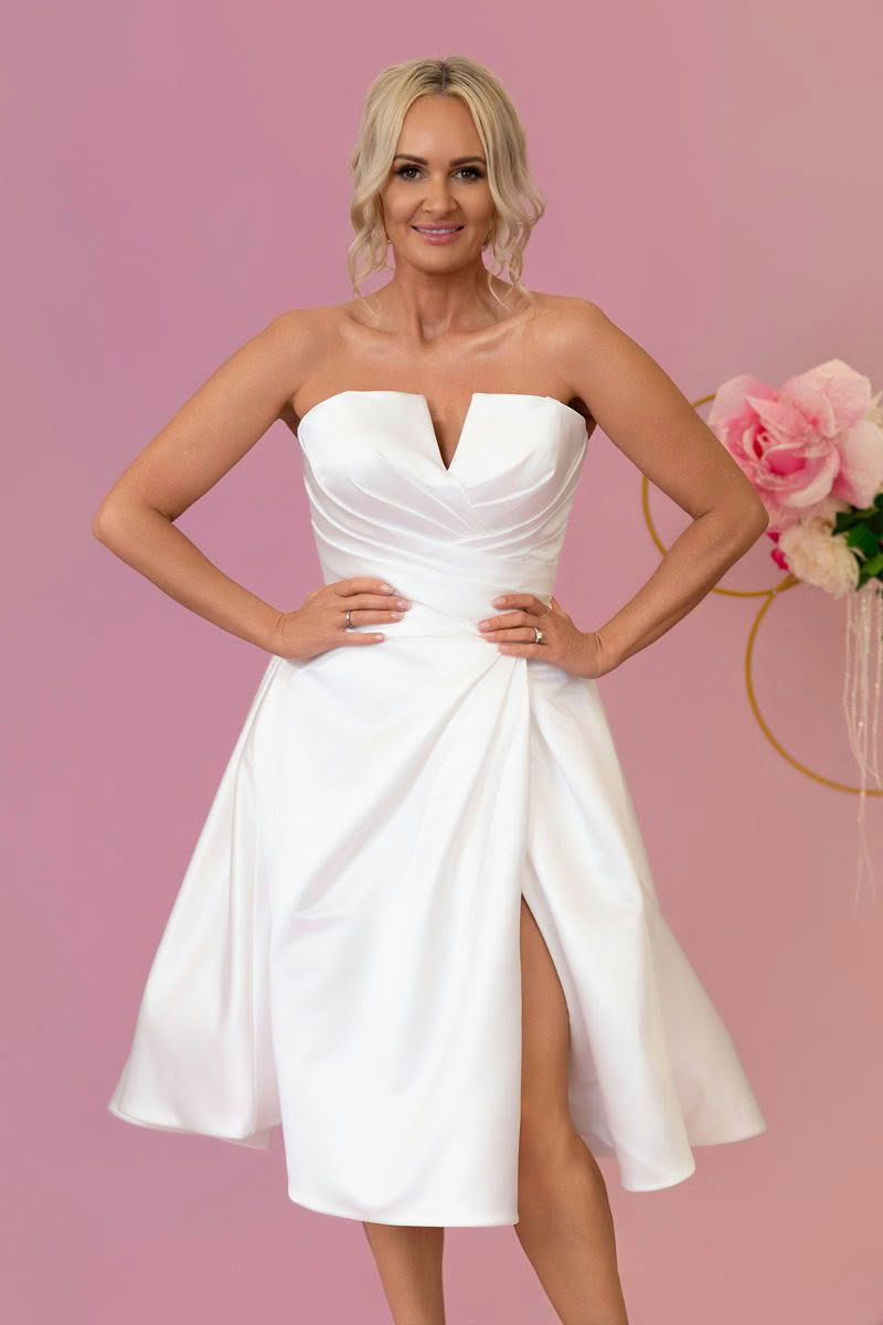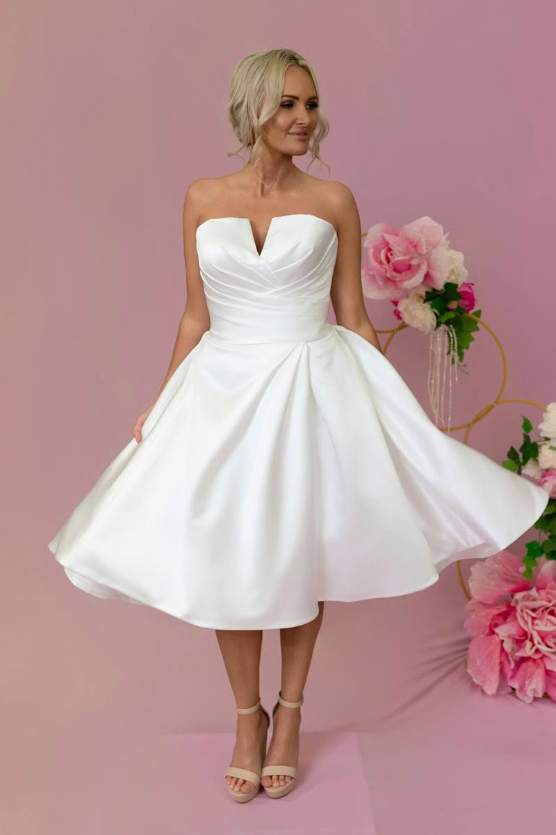 The Poppy Tea is timeless with a modern twist, a satin A-line mini featuring a structured strapless bodice, soft pleating through the waist, and a subtle notch neckline. The tea-length skirt and thigh-high split add just the right touch of flirtation and movement. Perfect for rehearsal dinners, civil ceremonies, or the ultimate bridal after-party. ✨ Exclusively for in-store hire.