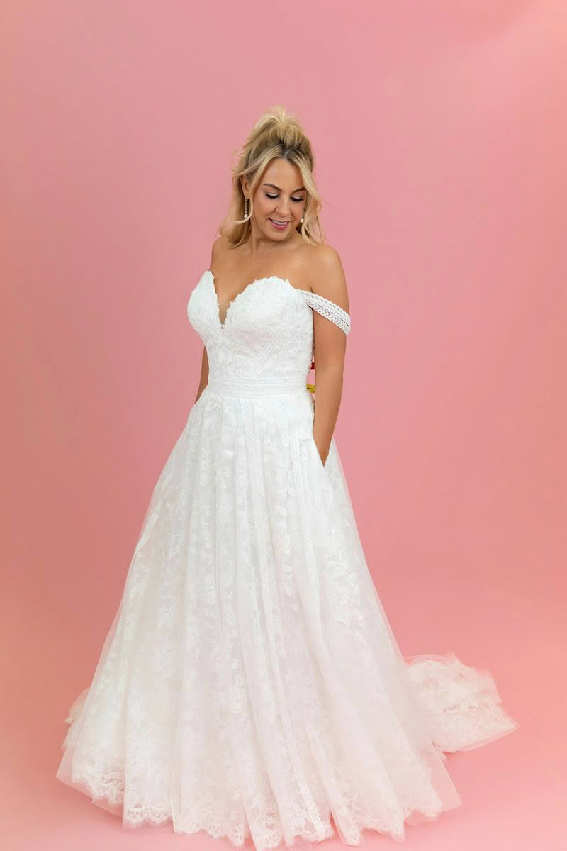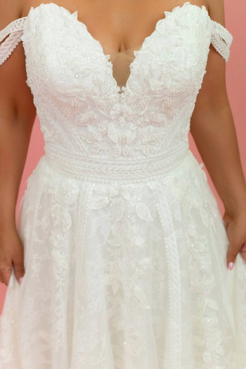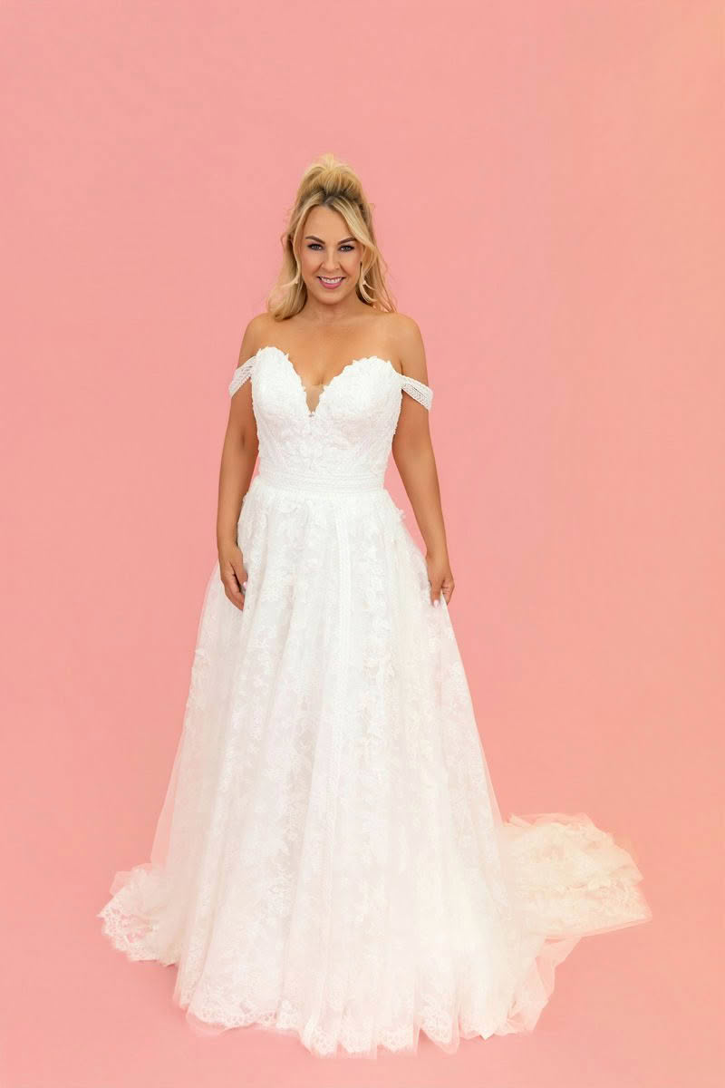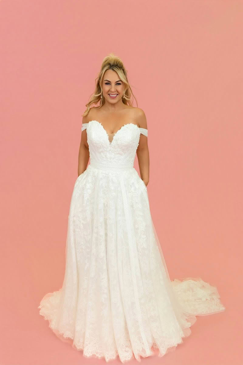 Romantic, soft and beautifully detailed, Celestial Dream is designed for the bride who wants effortless elegance with a touch of whimsy. The gown features a flattering off-the-shoulder neckline with delicate lace straps that frame the décolletage and highlight the shoulders.