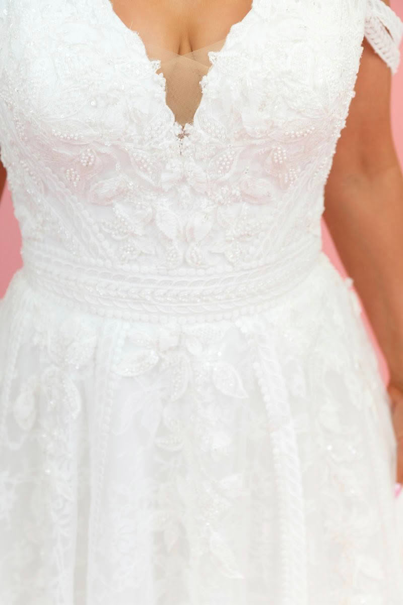 From the waist, layers of delicate lace and tulle fall into a dreamy A-line skirt that moves gracefully with every step. The lightweight silhouette creates a romantic, floaty feel, while the detailed lace throughout the gown adds timeless bridal beauty.