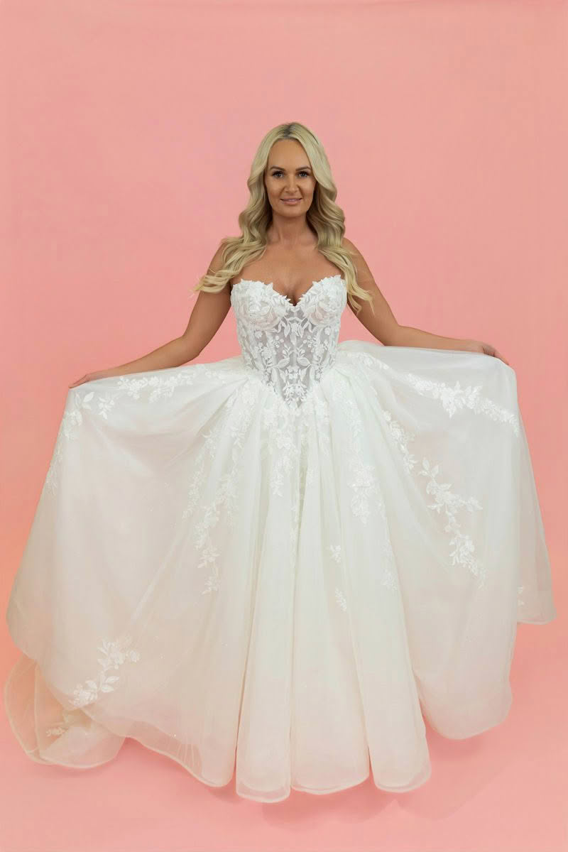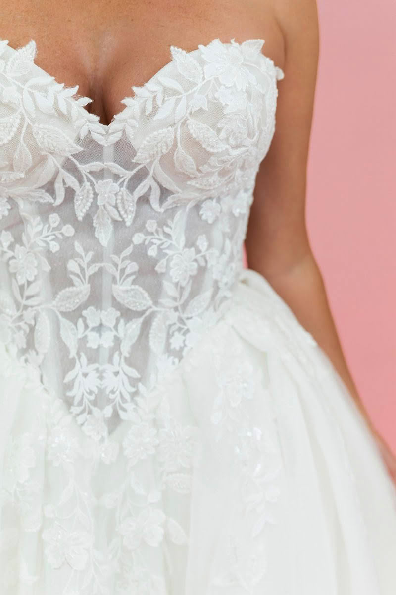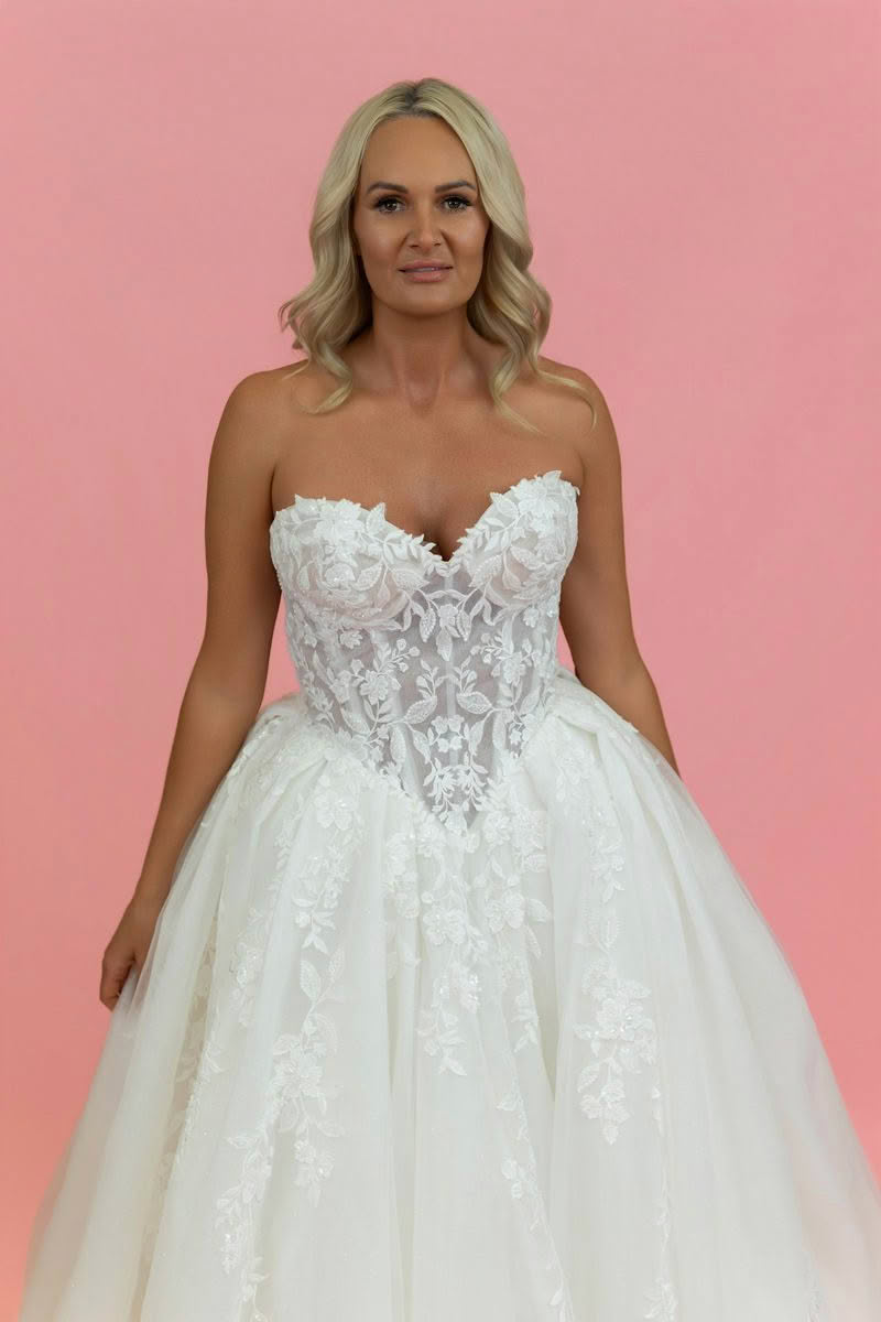 This romantic strapless ball gown wedding dress features a structured lace bodice with delicate floral appliqué and a flattering sweetheart neckline. The sheer illusion corset-style bodice creates a sculpted silhouette while soft floral lace flows effortlessly into a full tulle skirt for a timeless princess-inspired look.