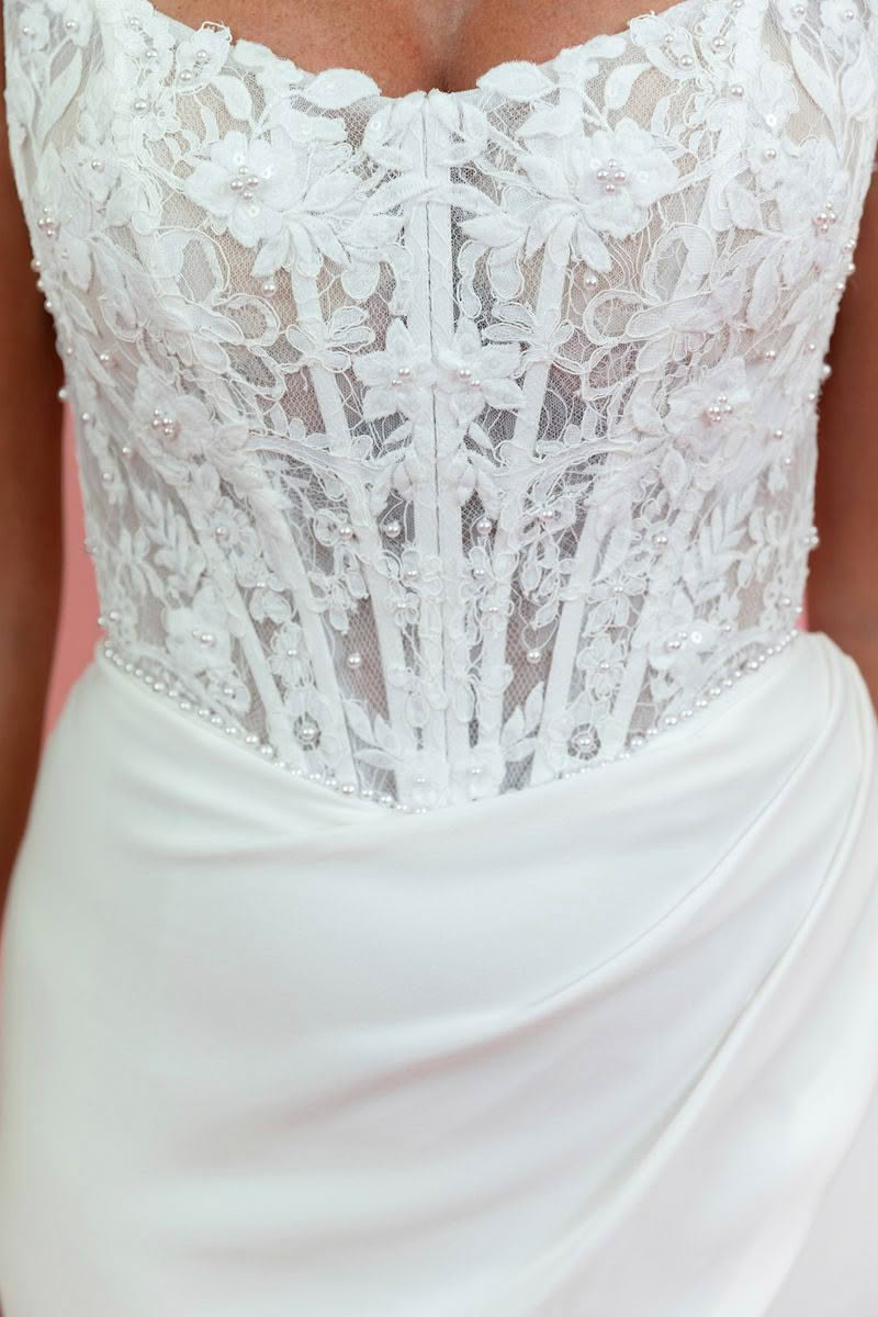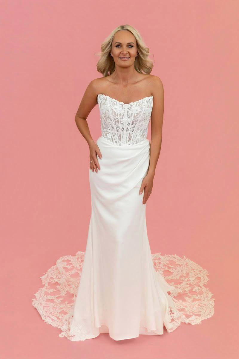 Lunar Glow is a modern bridal gown designed for effortless elegance. The strapless lace corset bodice sculpts the waist with delicate floral appliqué and subtle pearl detailing, while the softly draped satin skirt creates a sleek and flattering silhouette. A romantic lace train completes the look, making Lunar Glow the perfect balance of contemporary sophistication and timeless bridal beauty.