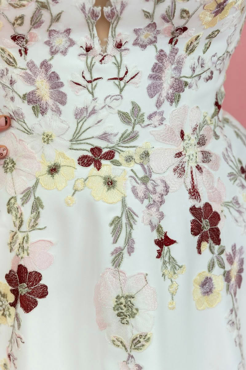 Radiant Star is a breathtaking embroidered A-line wedding dress designed for brides who want romance with a modern, artistic twist. The gown features a flattering plunging neckline framed by elegant straps and a softly structured bodice adorned with intricate multicolour floral embroidery.