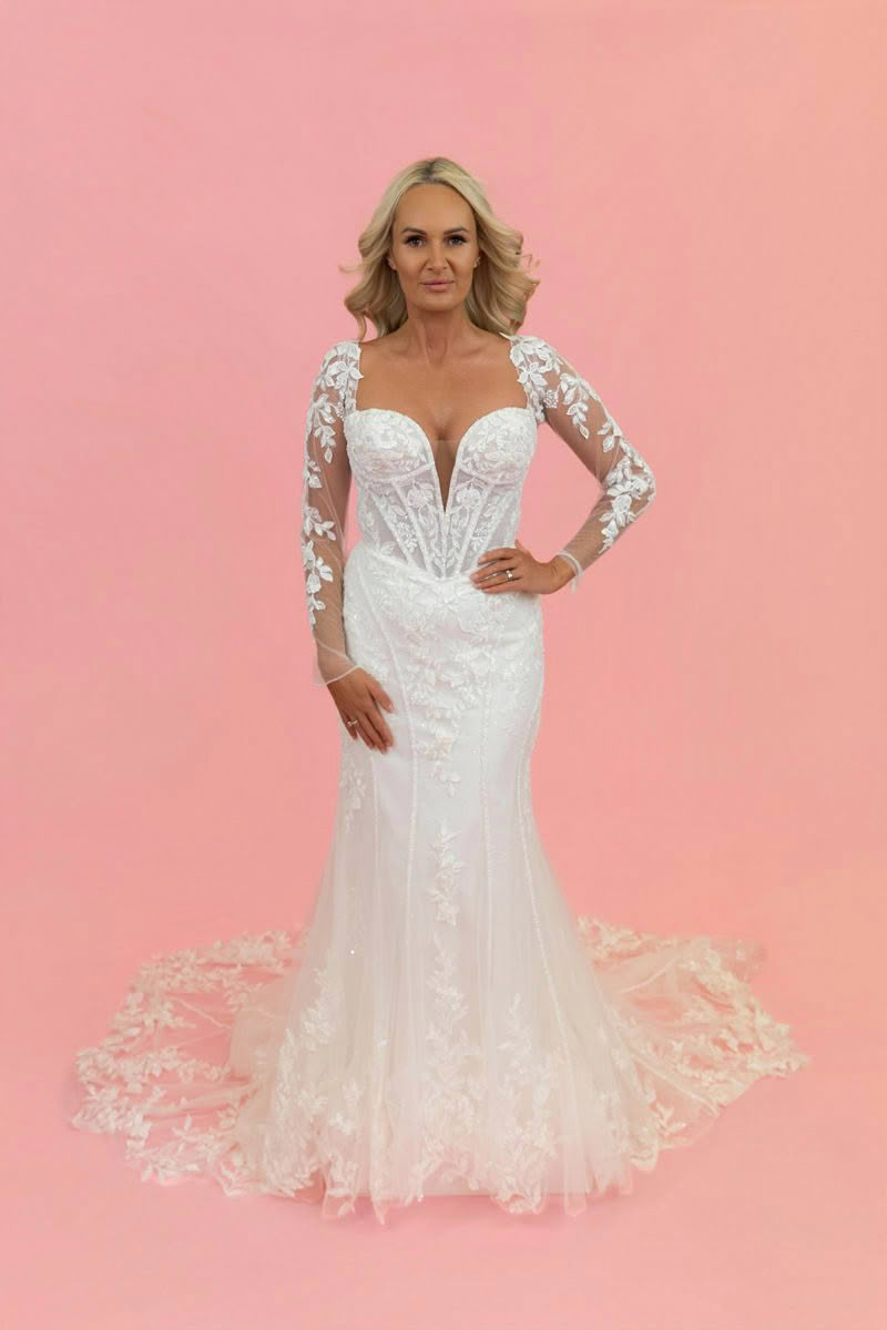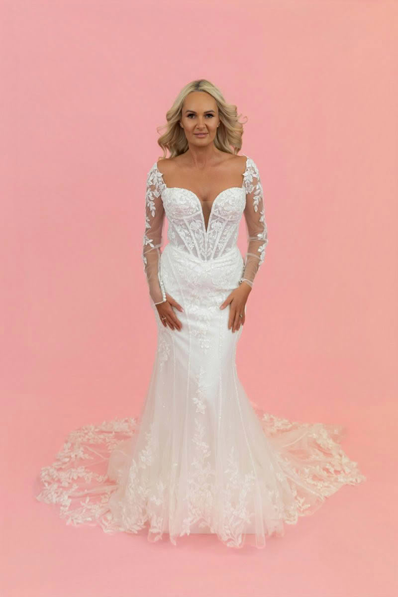 Soft floral lace flows from the bodice down through the fitted skirt, enhancing the shape before extending into a romantic lace-trimmed train. The result is a gown that combines modern structure with timeless bridal romance.