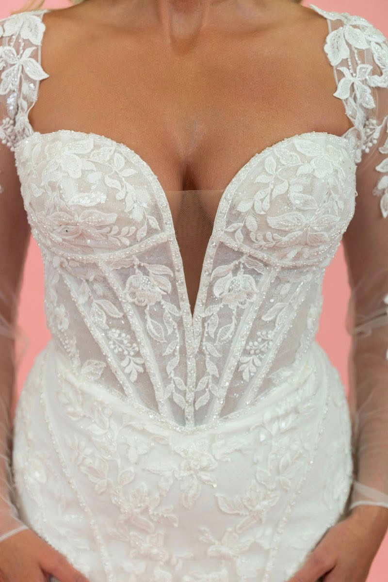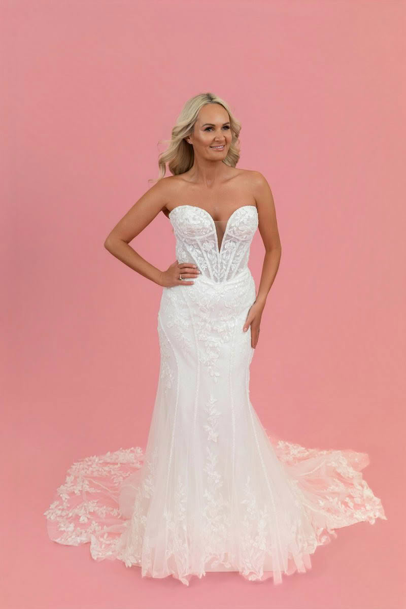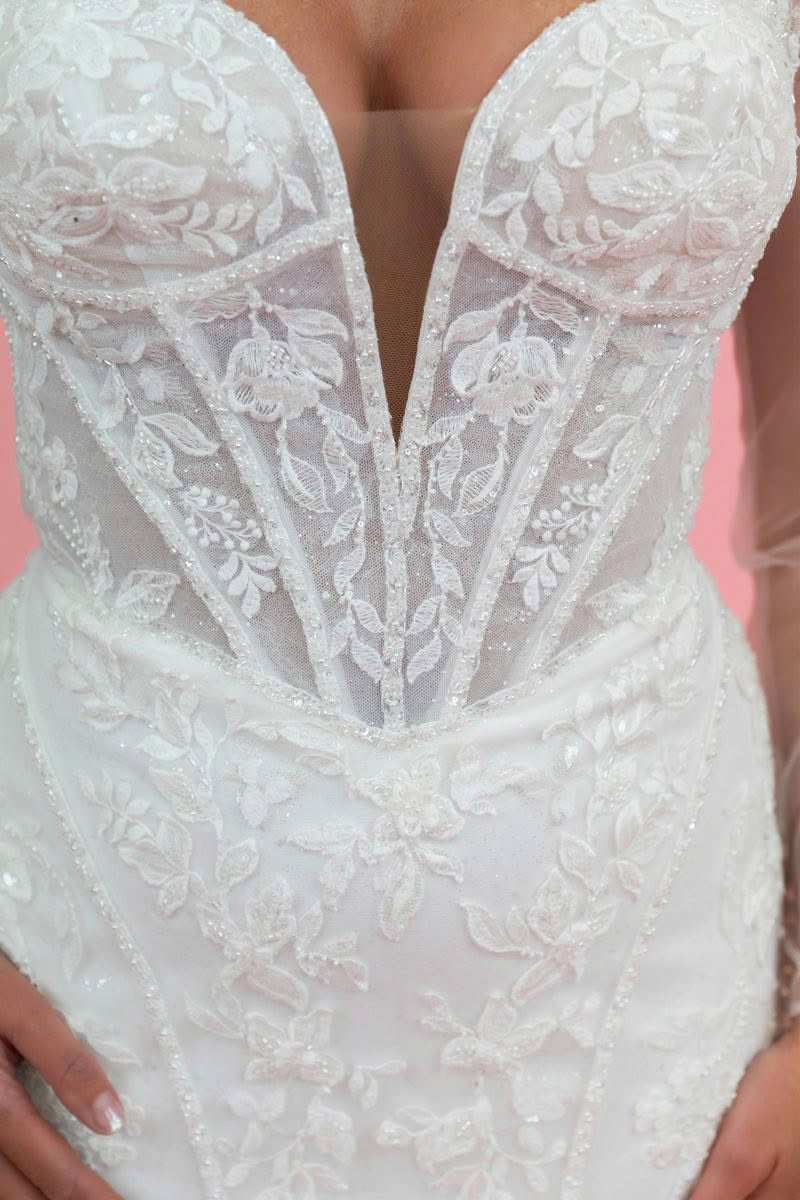 This elegant lace fit and flare wedding dress features a structured strapless corset bodice with delicate floral appliqué and a flattering plunging neckline. The sheer illusion bodice highlights intricate boning detail, sculpting the waist and creating a beautifully contoured bridal silhouette.