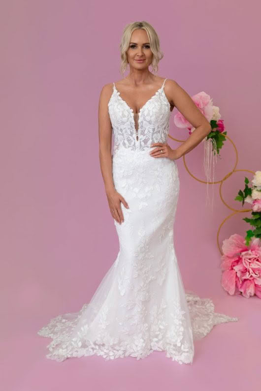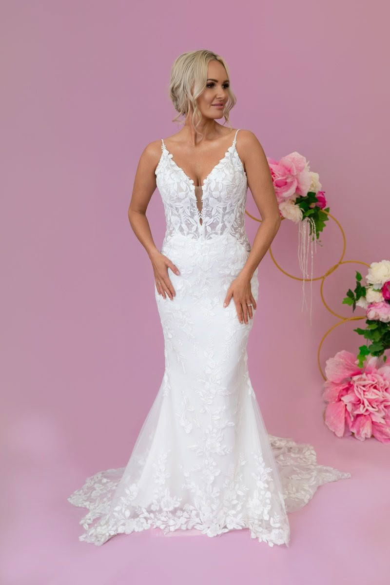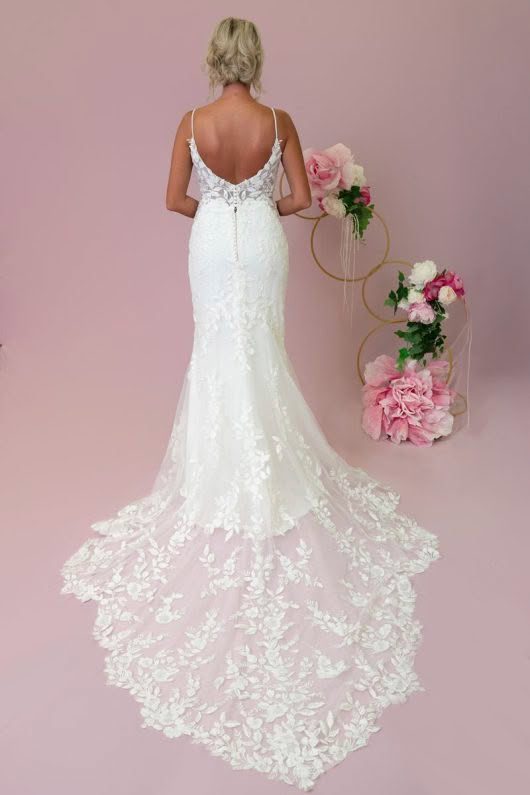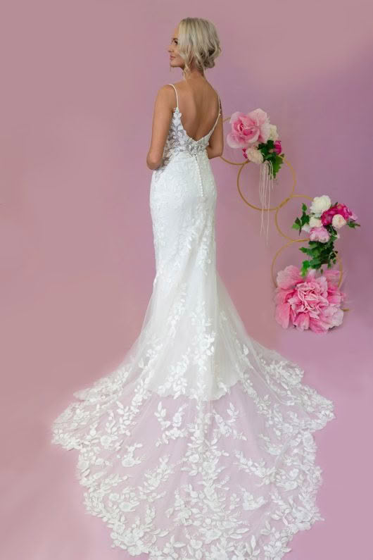 Bodie is sleek, romantic, and oh-so-chic. With a figure-hugging lace bodice, plunging neckline, and dainty straps, this gown flatters the feminine silhouette. The floral appliqué trails down the fitted skirt and into a semi-sheer illusion train, creating a dramatic yet delicate finish. Bodie is perfect for brides who want a touch of modern glamour wrapped in romance.
