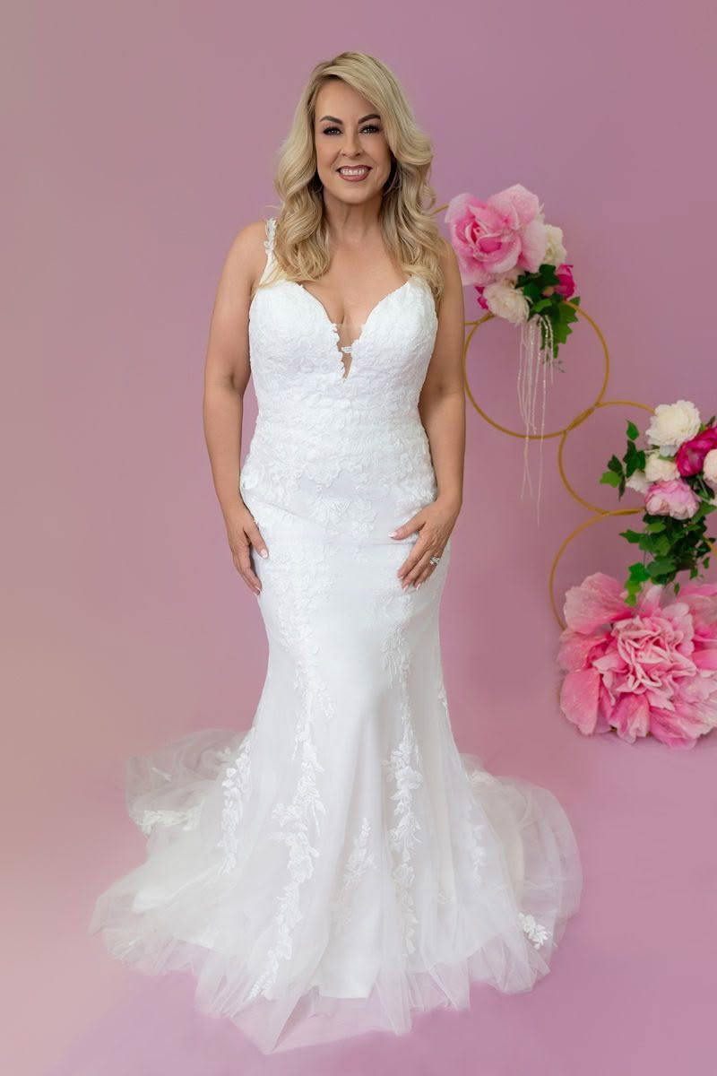 Mae is a romantic lace dream. With a plunging neckline, delicate straps, and floral lace appliqué throughout, this gown highlights the feminine figure with elegance. The fitted silhouette flares into a chapel-length train, making Mae perfect for brides who want both sensuality and softness.