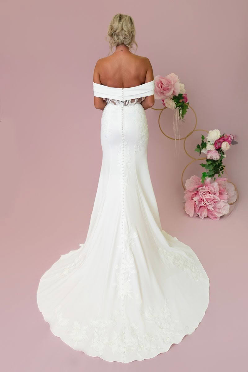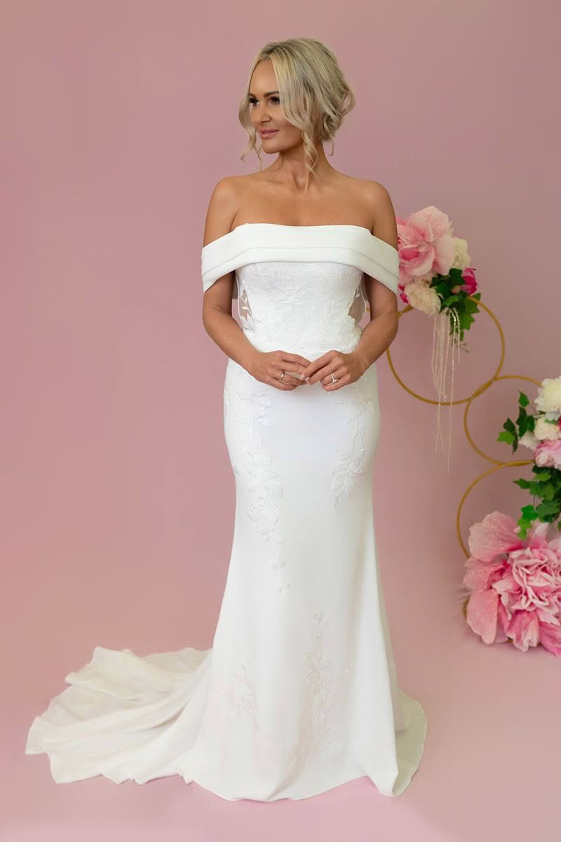 Amber is a vision of refined elegance. Featuring an off-the-shoulder neckline with draped detailing, this fitted gown is adorned with soft floral embroidery that elongates the figure. The sleek silhouette gently hugs the body before flowing into a graceful train, creating the perfect blend of romance and modern sophistication.