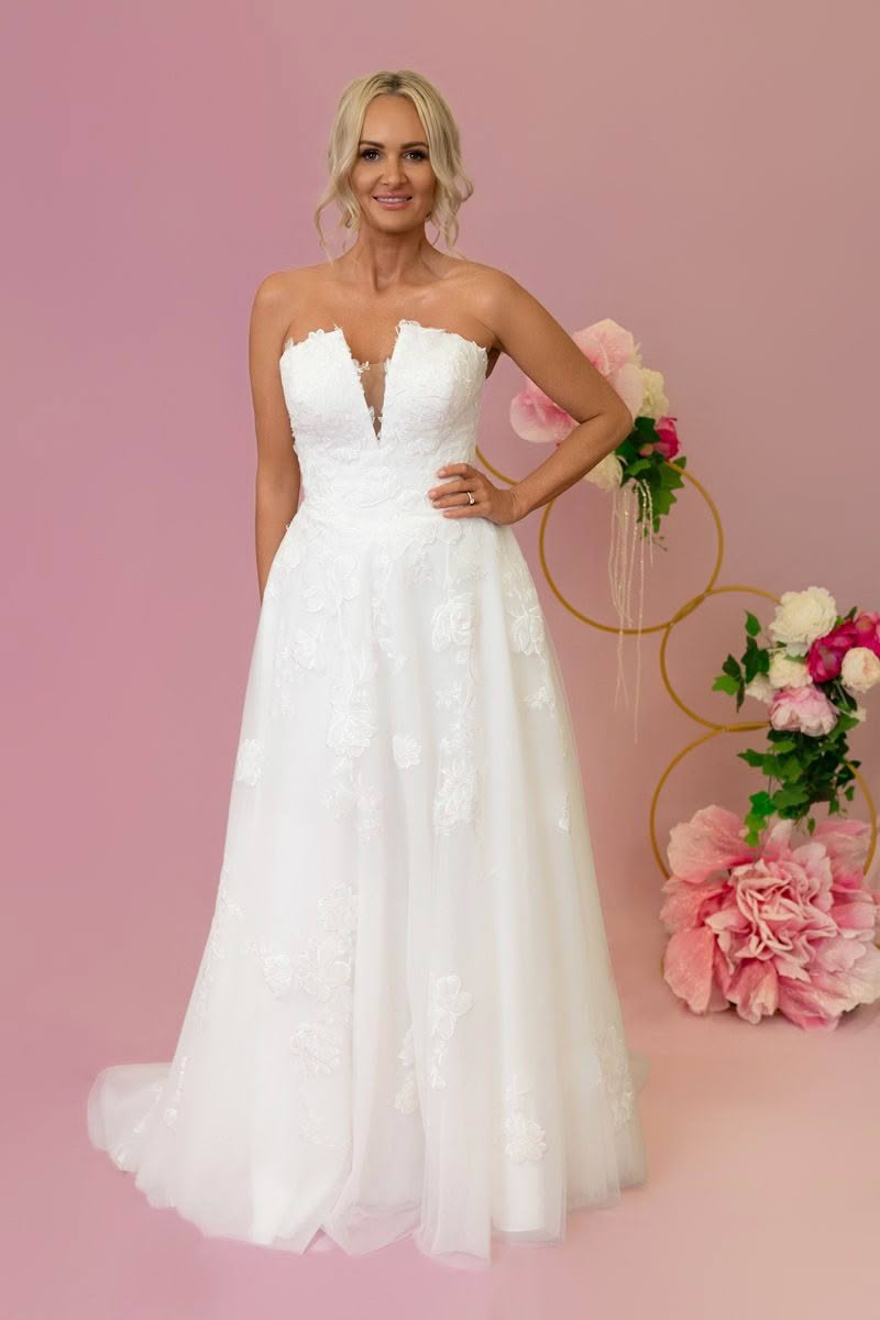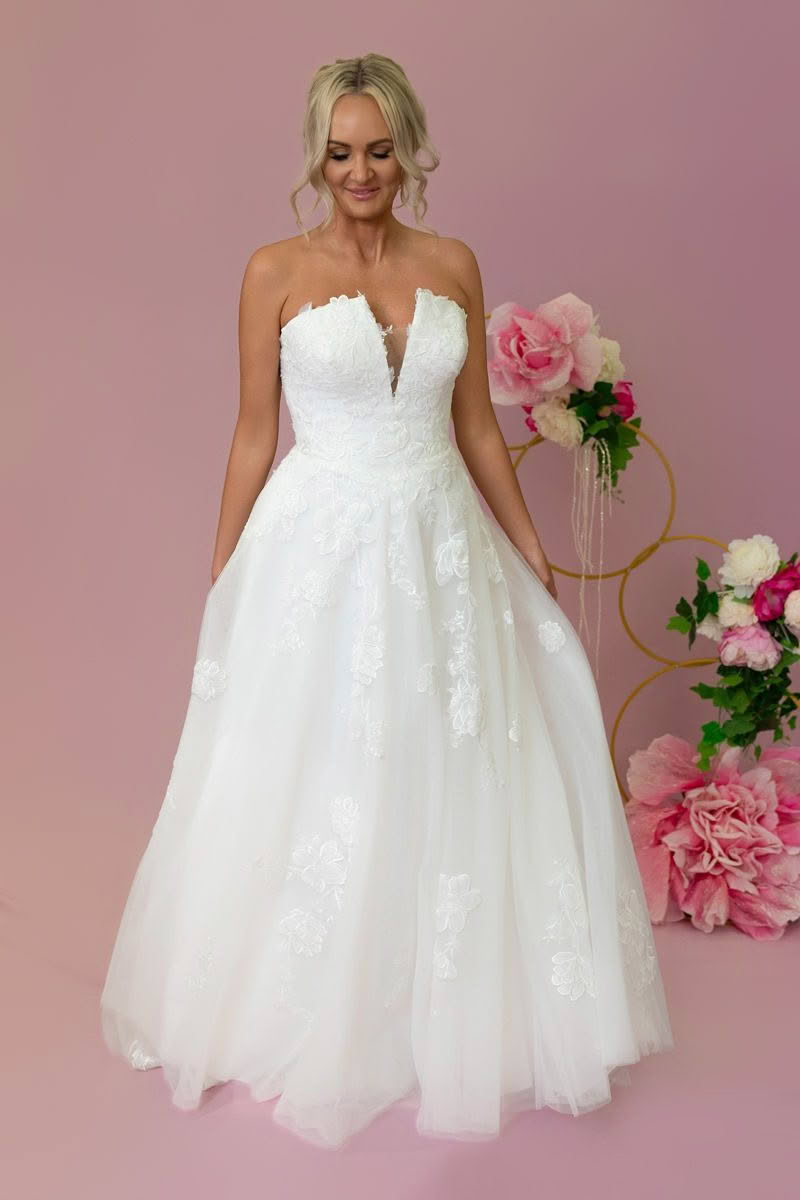 Bianca is a floral dream brought to life. The strapless sweetheart neckline with illusion plunge detail is perfectly paired with a flowing A-line skirt adorned with delicate lace appliqué. Feminine, flattering, and endlessly romantic, Bianca is a gown that celebrates modern bridal beauty while keeping tradition close to heart.