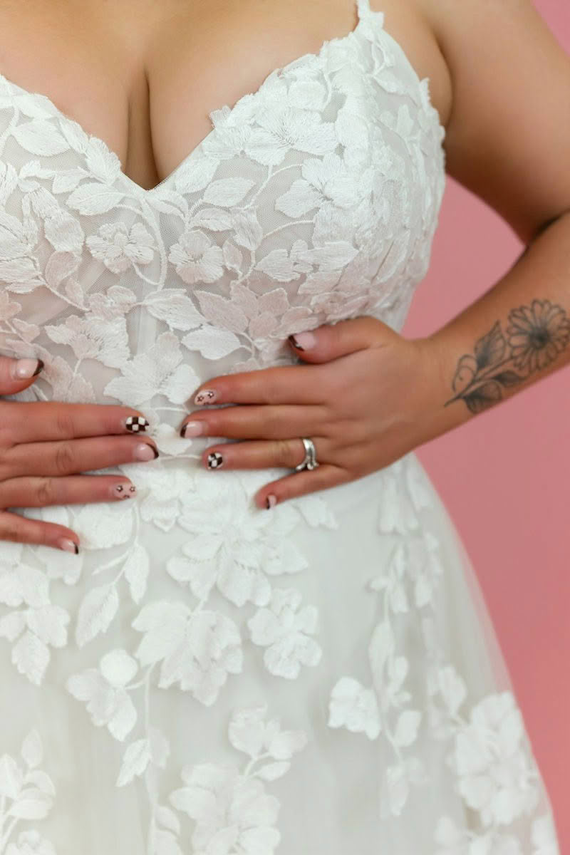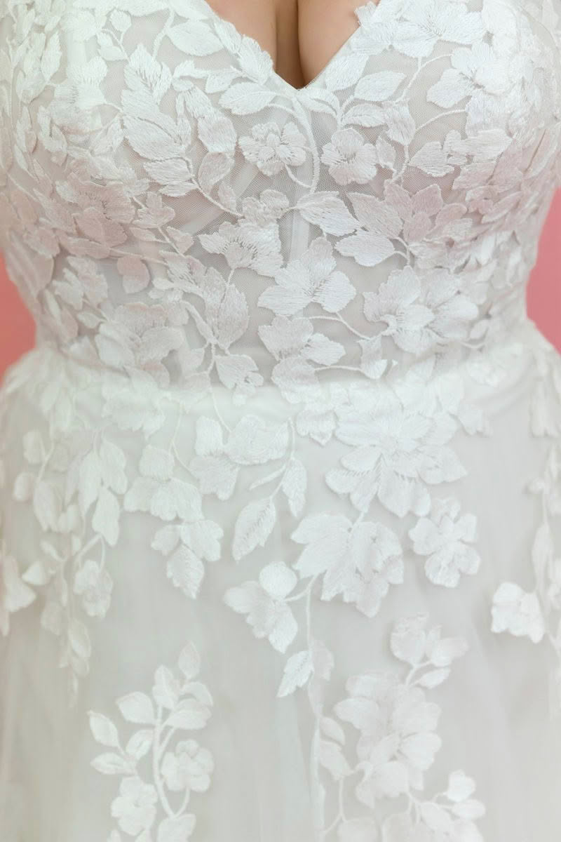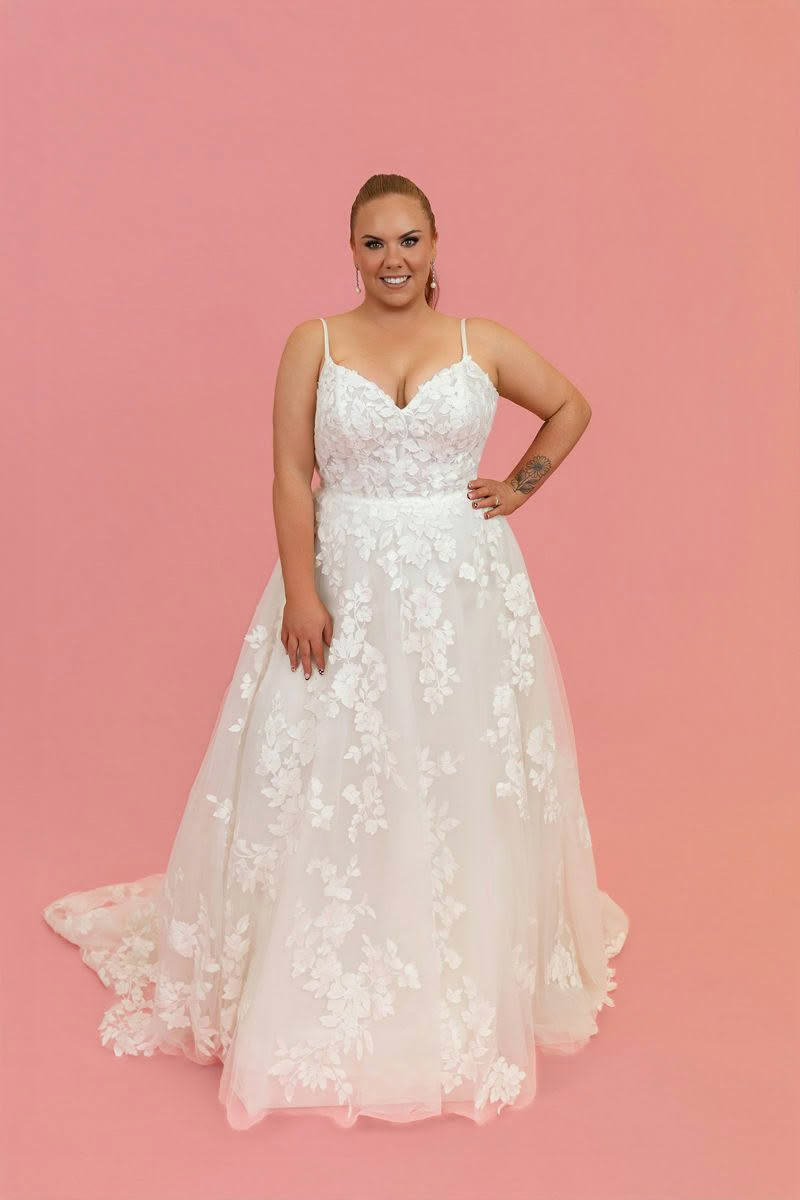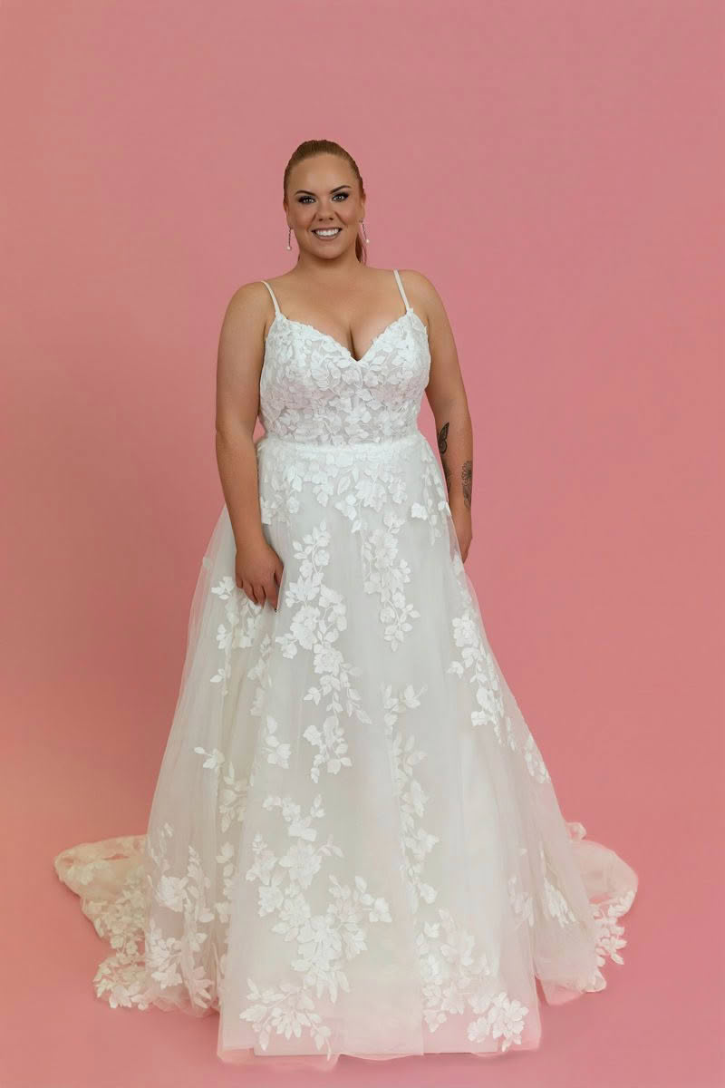 Sheer and elegant, Style D3771 features an allover matte floral lace that brings pure romance to the aisle. From sleek spaghetti straps, the sheer bodice highlights the figure with a soft V-neckline and subtle scoop back detail. From the waist, a flowing tulle A-line skirt moves freely, showcasing a gorgeous display of perfectly-placed lace appliqués throughout this plus size wedding gown. For the final romantic touch, a timeless lace-edged shaped train sweeps behind for an idyllic walk down the aisle.