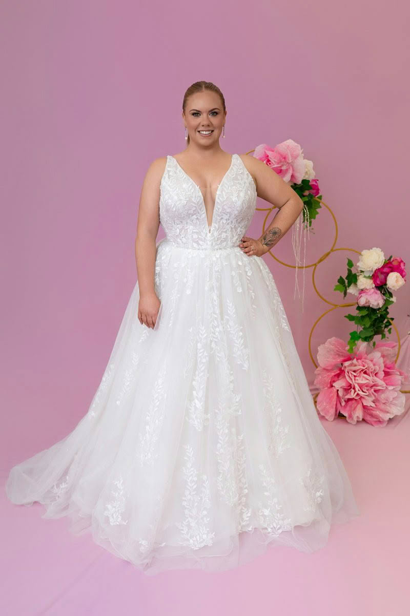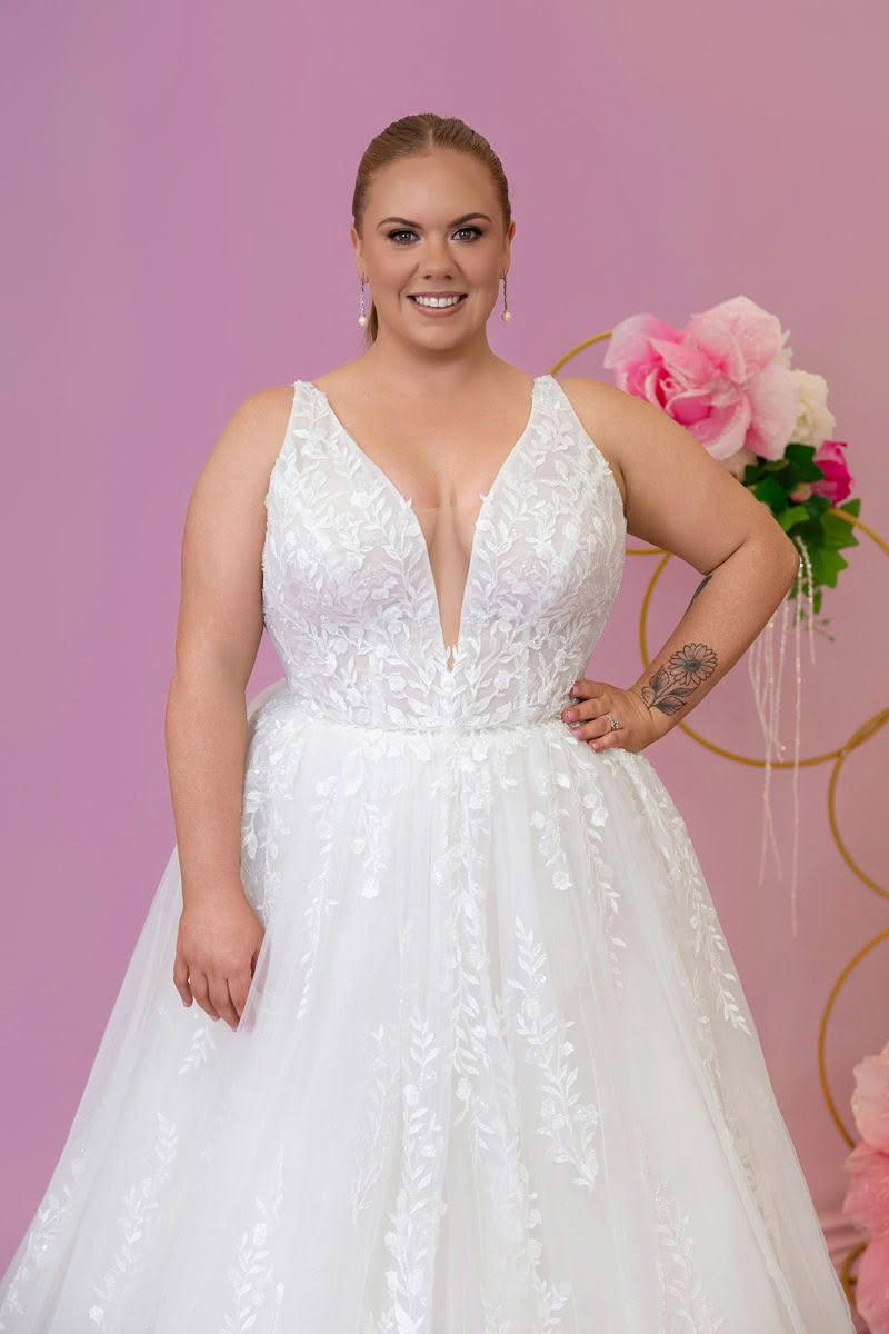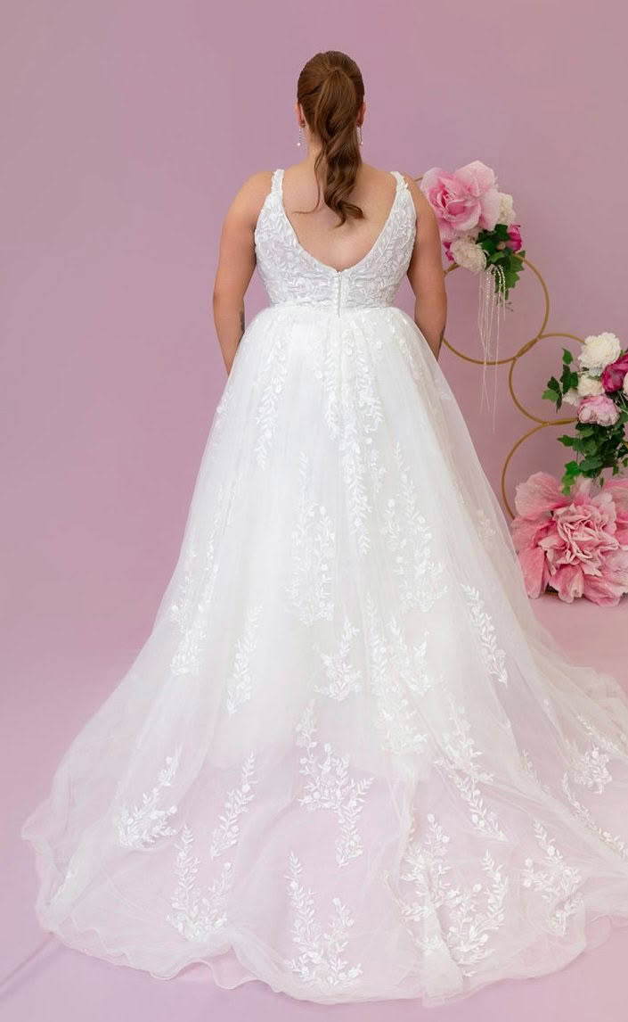 Sparkling down the aisle, Style D4007’s dreamy leafy floral lace and organza over optional glitter tulle captures the ethereal essence of this romantic A-line wedding gown. Lace-embellished shoulder straps frame a plunging V-neckline topping the sheer, glittering bodice. Leafy tendrils and sparkling floral accents scatter from the bodice to the frothy tulle A-line skirt, evoking a wistful, dreamlike effect. With each step, the glittering tulle catches the light, shimmering for the modern romantic’s walk down the aisle.