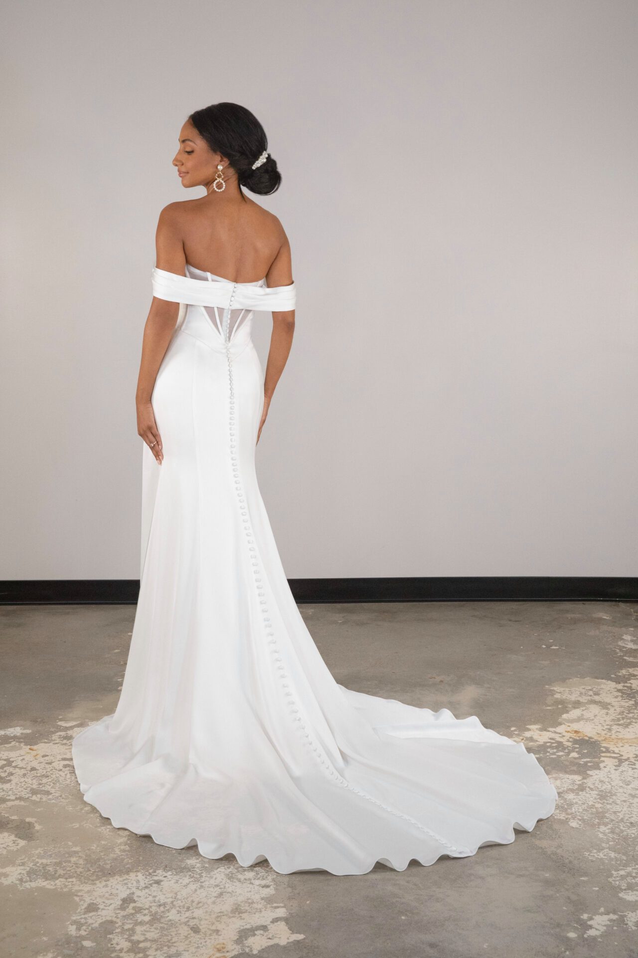 The lustrous Style D4093 offers a modern take on old Hollywood glamour. This modern fit-and-flare wedding gown is as versatile as it is fashion-forward. A detachable off-the-shoulder shawl add a glamorous Bardot neckline over a strapless chic bodice with structured architectural boning to accentuate the hourglass silhouette. A draped waist wraps around the hips, opening at the thigh for a sexy optional leg slit, and effortlessly flowing into a luxe flared skirt. For a clean and chic bridal look with subtle designer details, this glamorous wedding gown has it all.