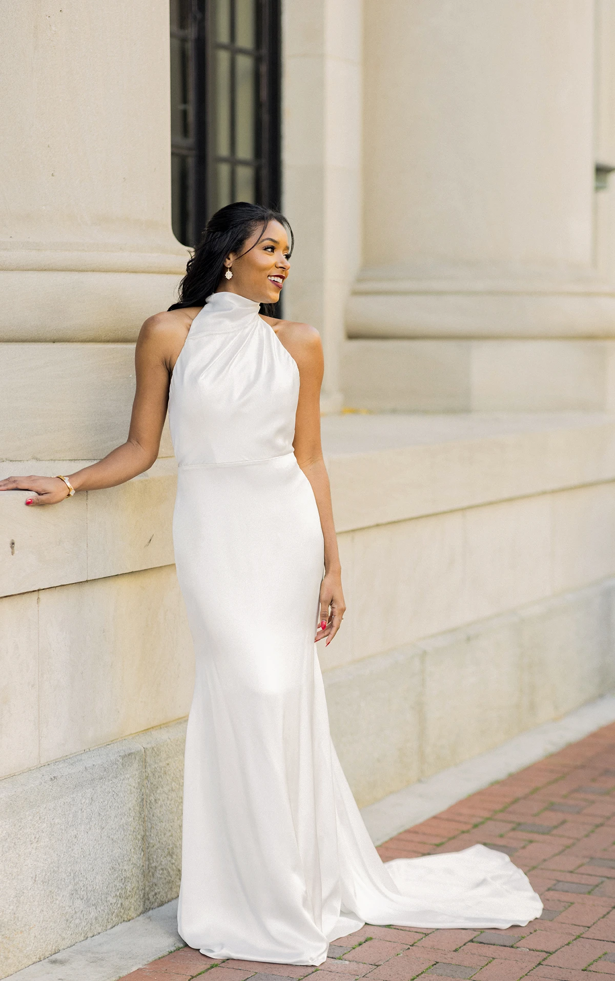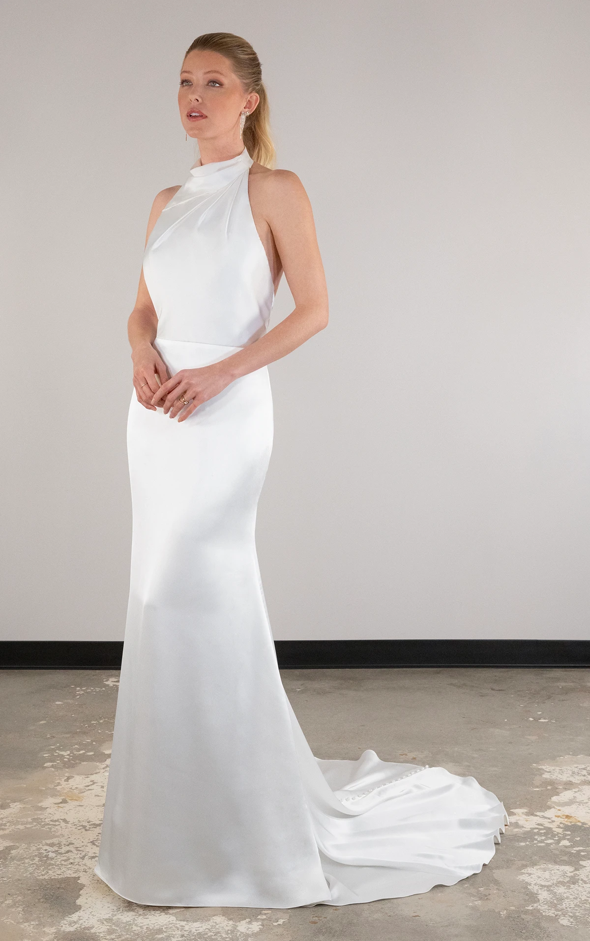 Luxe simplicity meets timeless elegance in Style D4123, a sexy halter wedding gown for the bride with refined style. A sophisticated draped halter neckline wraps the neck and folds into the tailored bodice before revealing a dramatic open back that meets the waistline. The fitted column silhouette hugs the figure with flattering seam work before gracefully extending into a soft sweeping train. Lined with timeless pearl buttons down the back, this high-neck, low-back wedding dress is ready for the runway and the aisle.