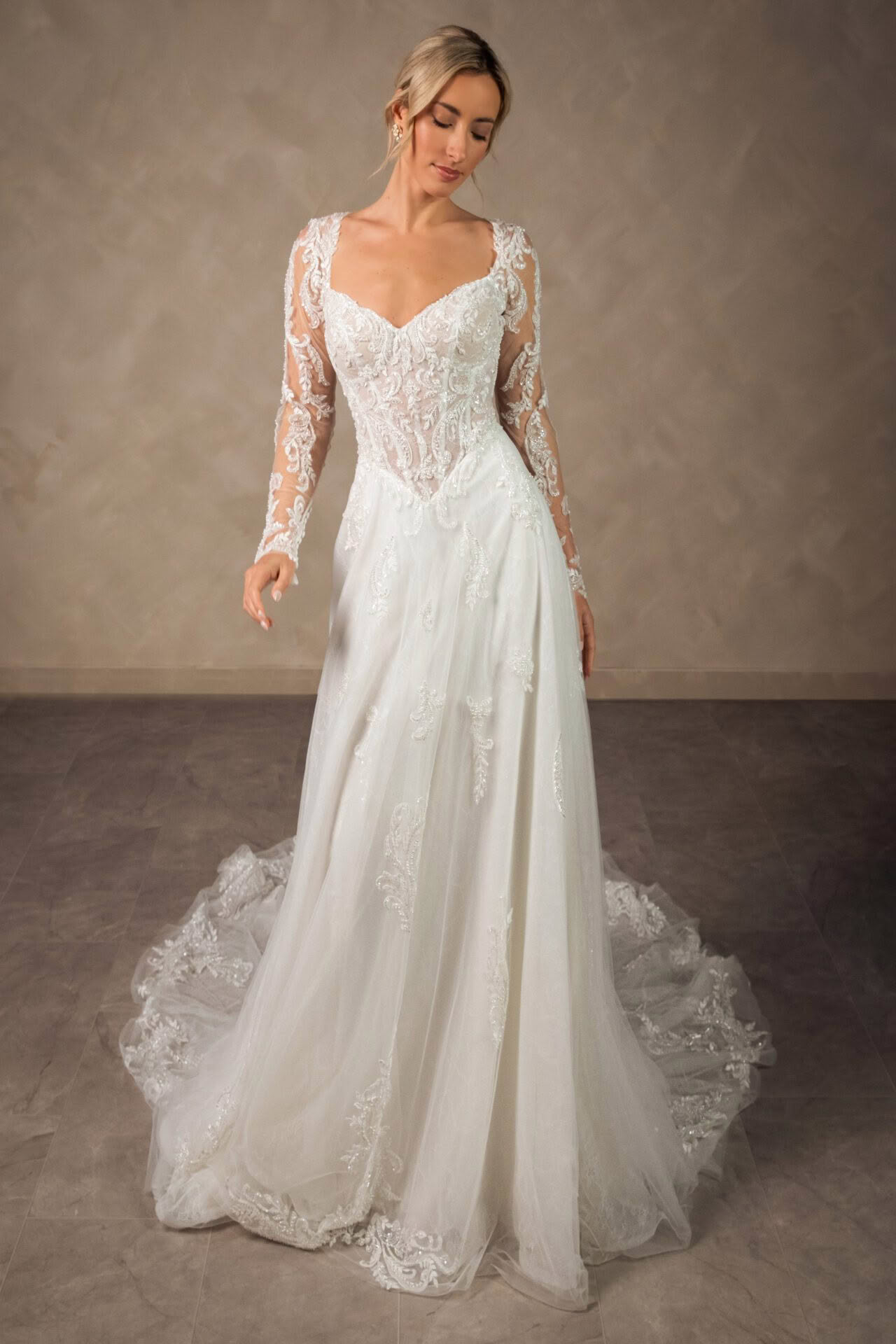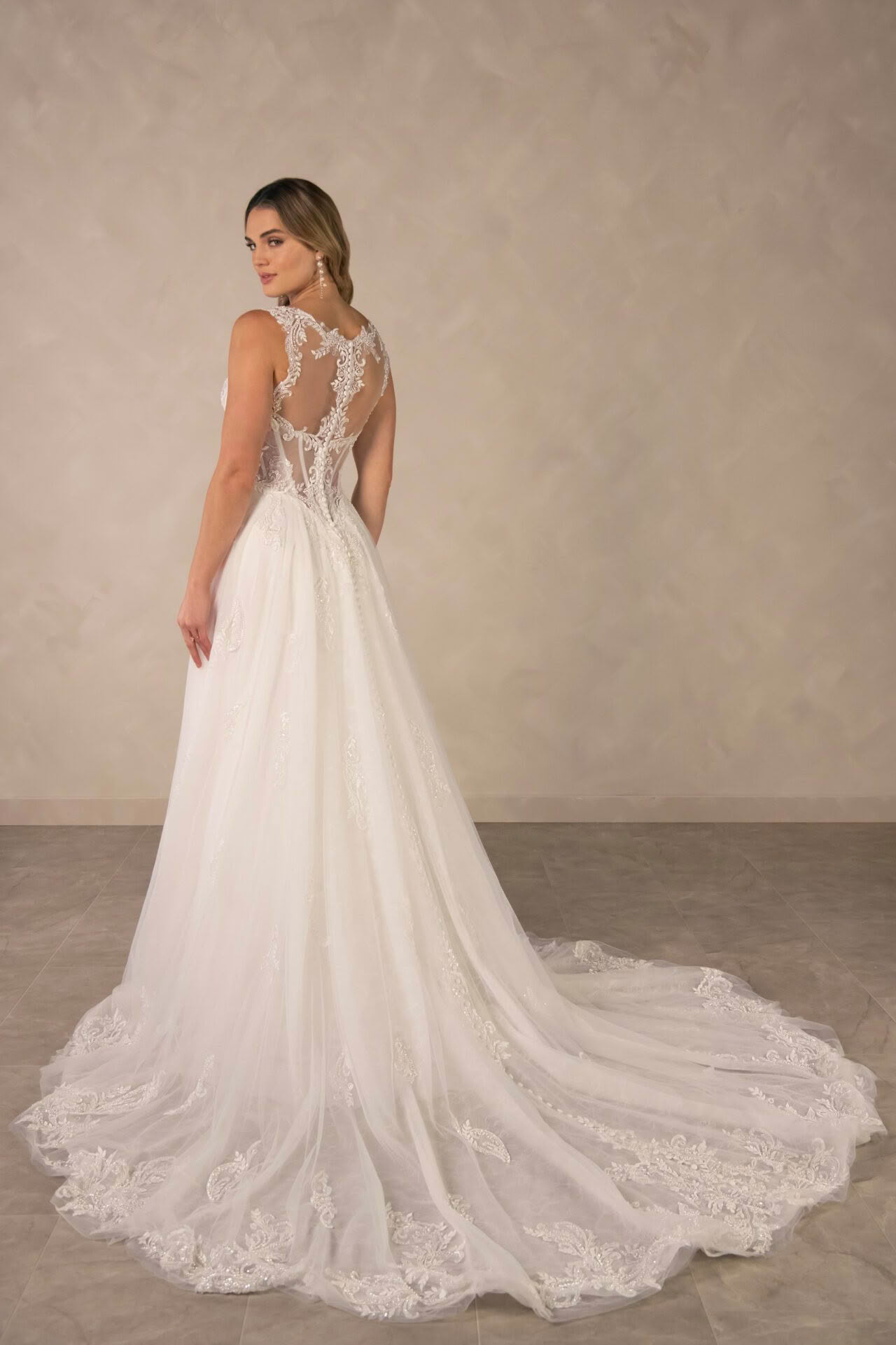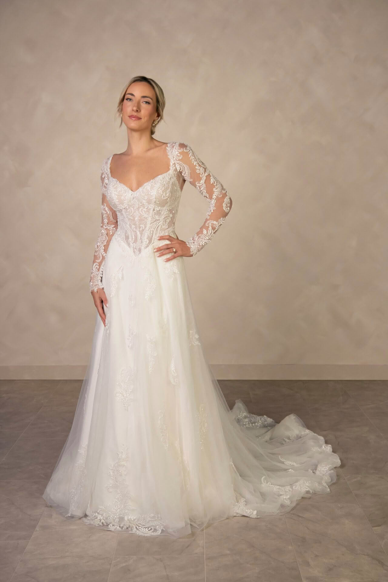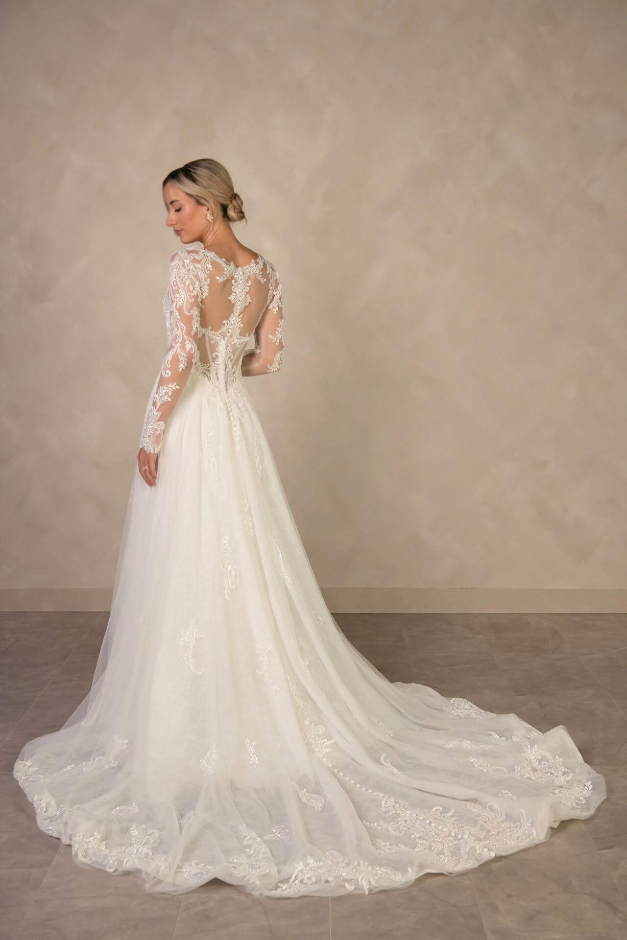 Style D4577 is a vision of romantic bridal artistry. The elegant sweetheart neckline is framed by delicate long sleeves crafted from intricate floral lace that extends into a semi-sheer or lined, corset-style bodice. A designed drop waist creates a flattering silhouette before transitioning into a voluminous A-like skirt layered with soft tulle and shimmering lace appliqués. The back reveals a breathtaking illusion detail with fabric-covered buttons that trail down the centre, leading the eye toward a graceful, wide train adorned with a scalloped lace hem. This enchanting gown captures a sense of classic sophistication.