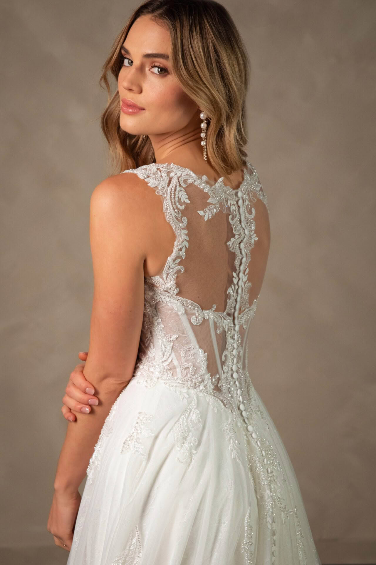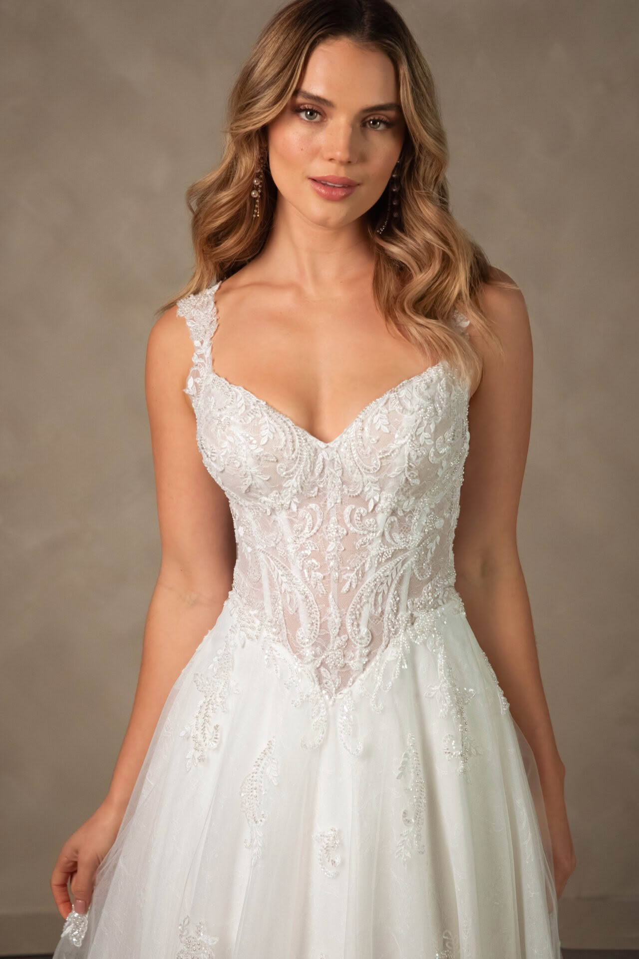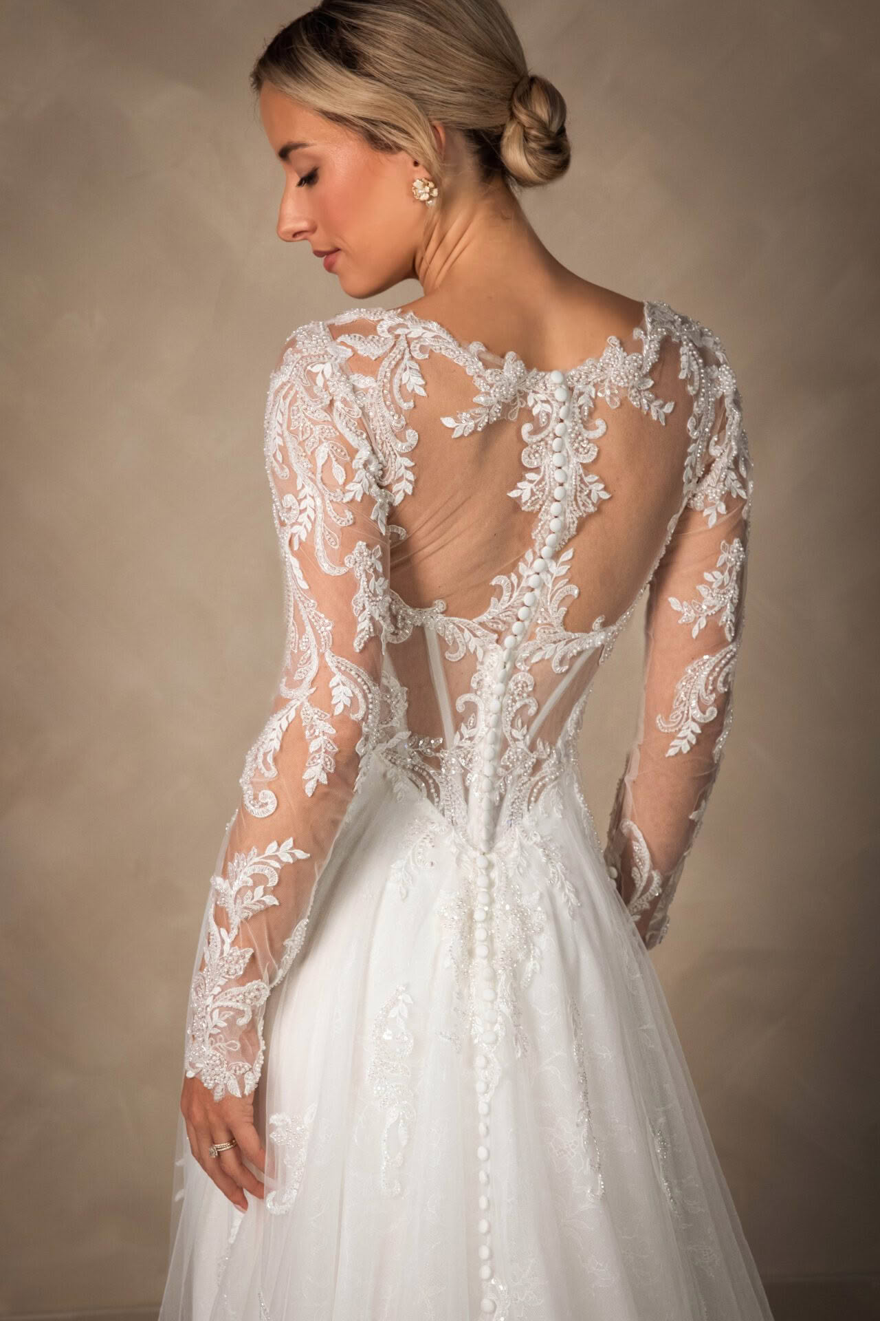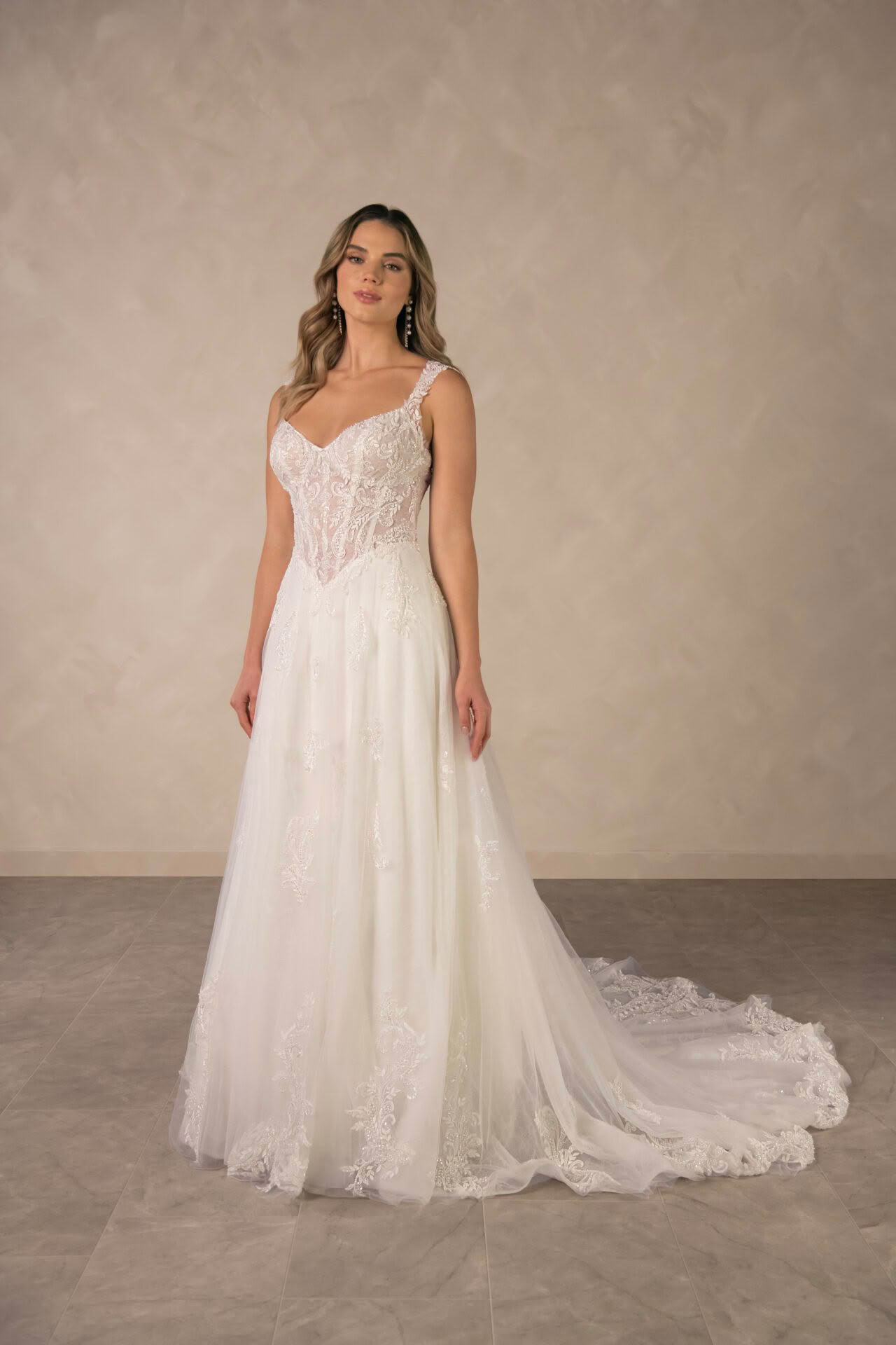 Style D4577 is a vision of romantic bridal artistry. The elegant sweetheart neckline is framed by delicate long sleeves crafted from intricate floral lace that extends into a semi-sheer or lined, corset-style bodice. A designed drop waist creates a flattering silhouette before transitioning into a voluminous A-like skirt layered with soft tulle and shimmering lace appliqués. The back reveals a breathtaking illusion detail with fabric-covered buttons that trail down the centre, leading the eye toward a graceful, wide train adorned with a scalloped lace hem. This enchanting gown captures a sense of classic sophistication.