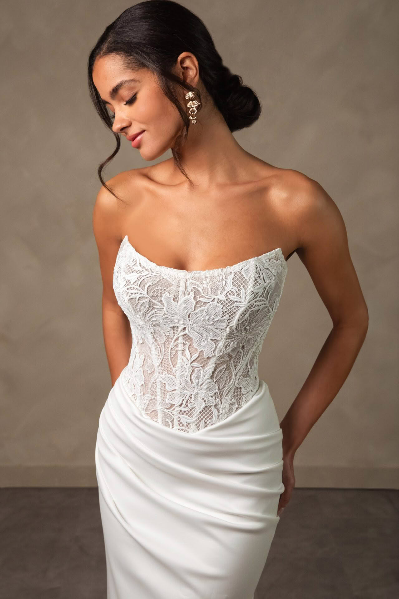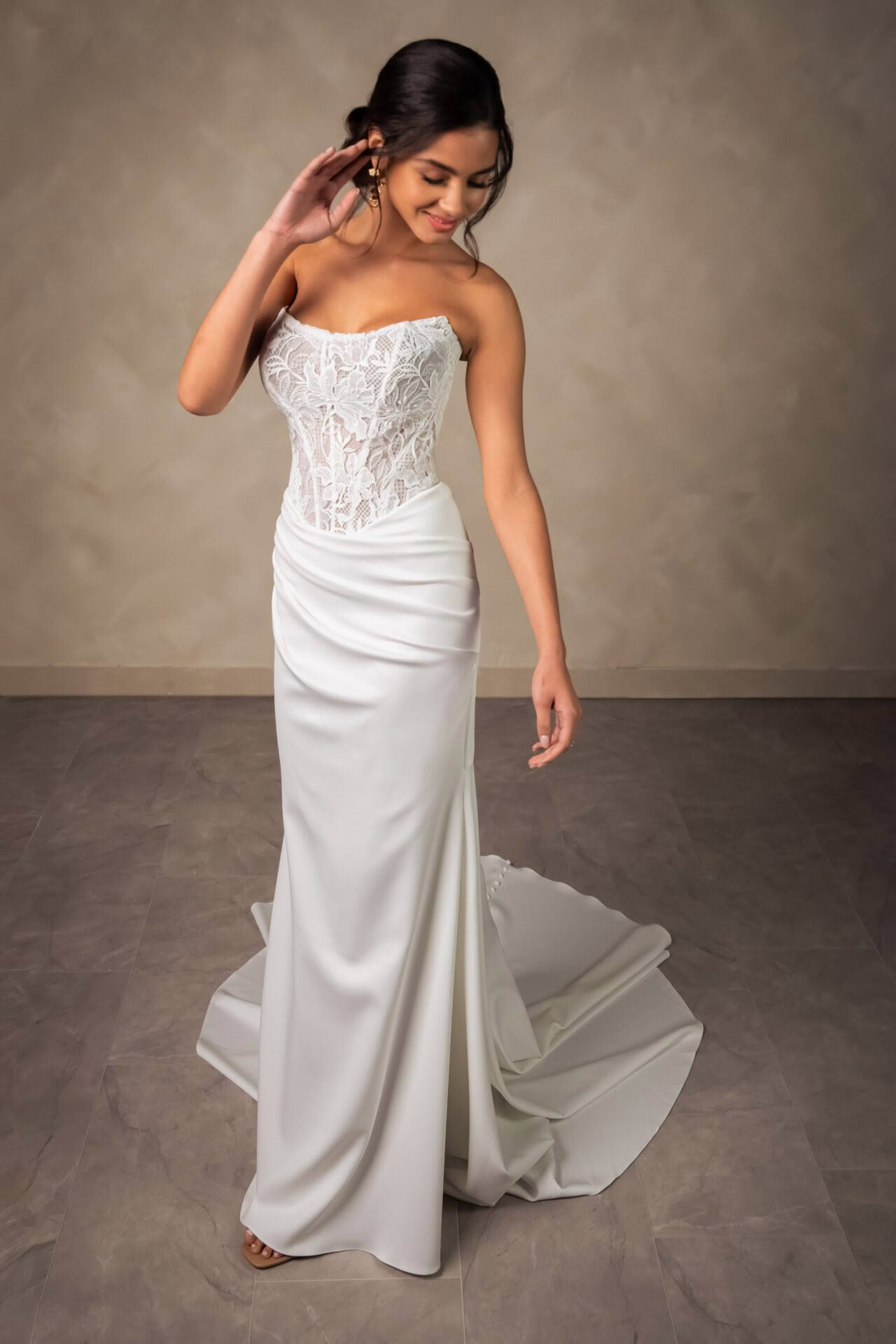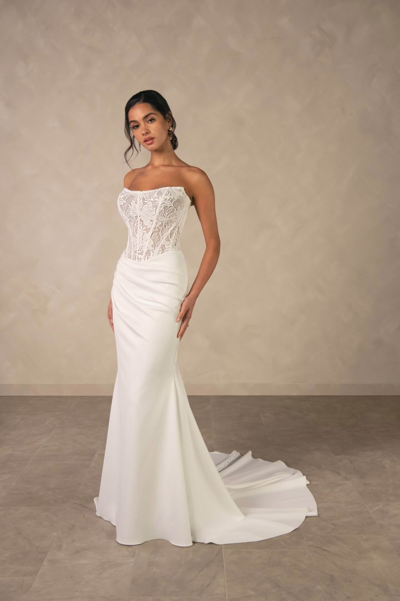 Effortlessly elegant with a modern edge, this strapless wedding dress is designed for the bride who loves clean lines with a touch of romance. The structured bodice features intricate lace detailing that softly contours the waist, creating a beautifully sculpted silhouette.