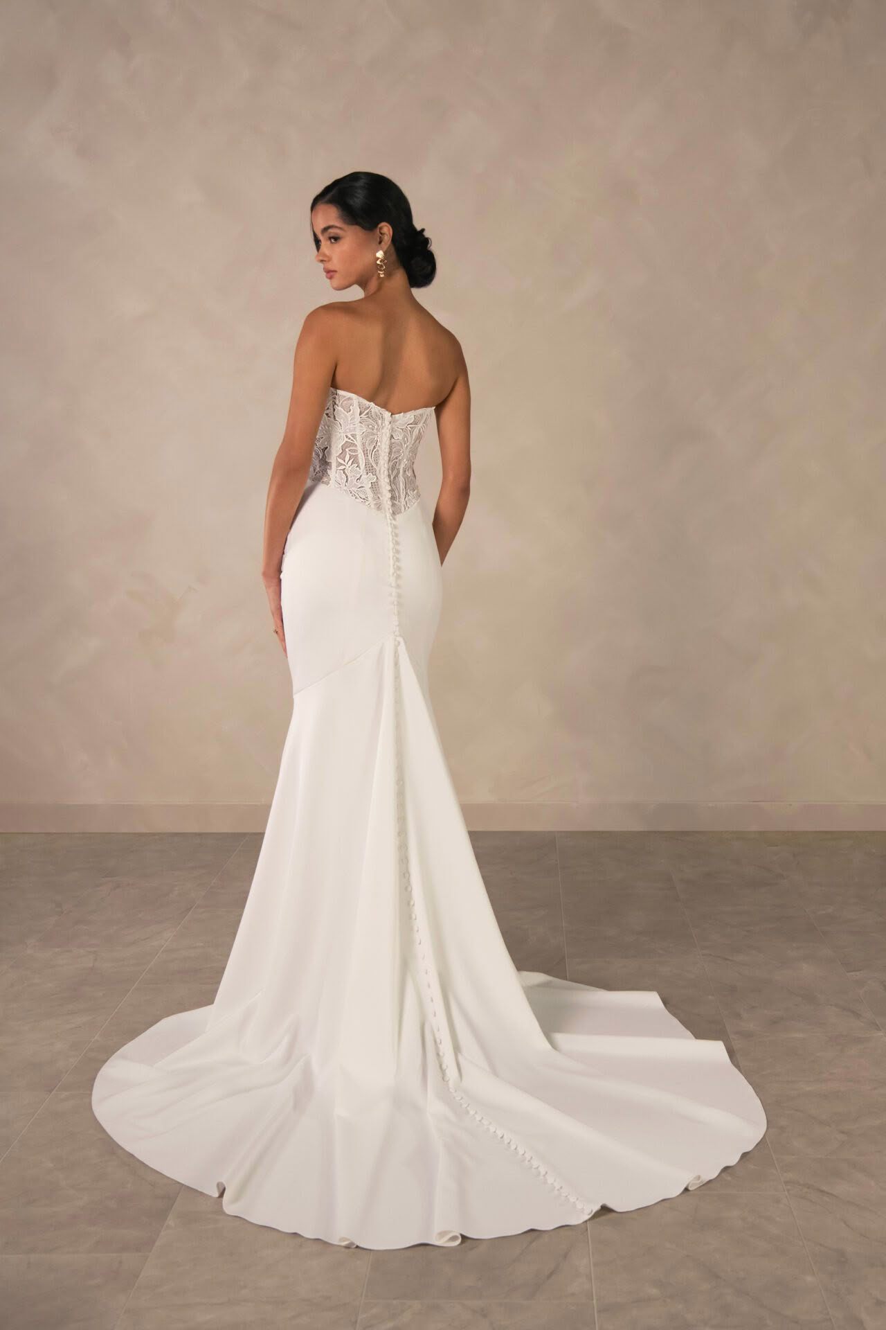Finished with a row of delicate buttons down the back and a soft, flowing train, this gown is the perfect balance of timeless sophistication and contemporary bridal style.