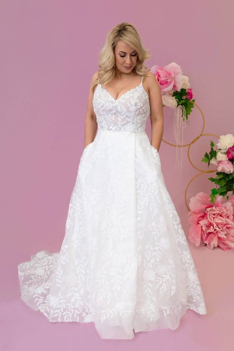 Introducing Dahlia, an elegant A-line wedding dress crafted from exquisite sheet lace with a subtle touch of beading on the bodice for added charm. This gown features a modest V-neckline and delicate straps, offering a refined and graceful look. The design is elevated by a chic side split, perfect for showcasing your personality, and hidden pockets for a modern, practical touch. Made with matte lace, Dahlia is ideal for the bride who appreciates understated beauty and timeless sophistication. A gown that combines comfort, style, and romance, Dahlia is truly unforgettable.