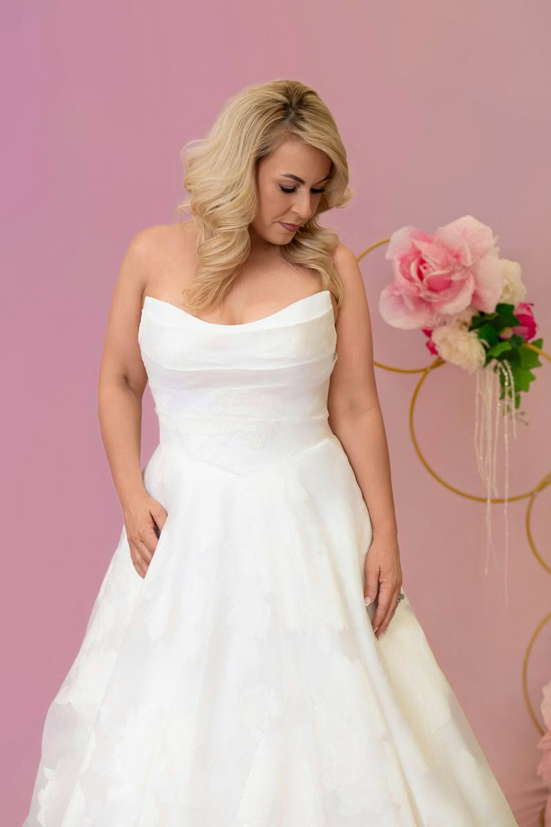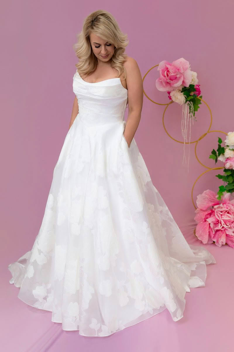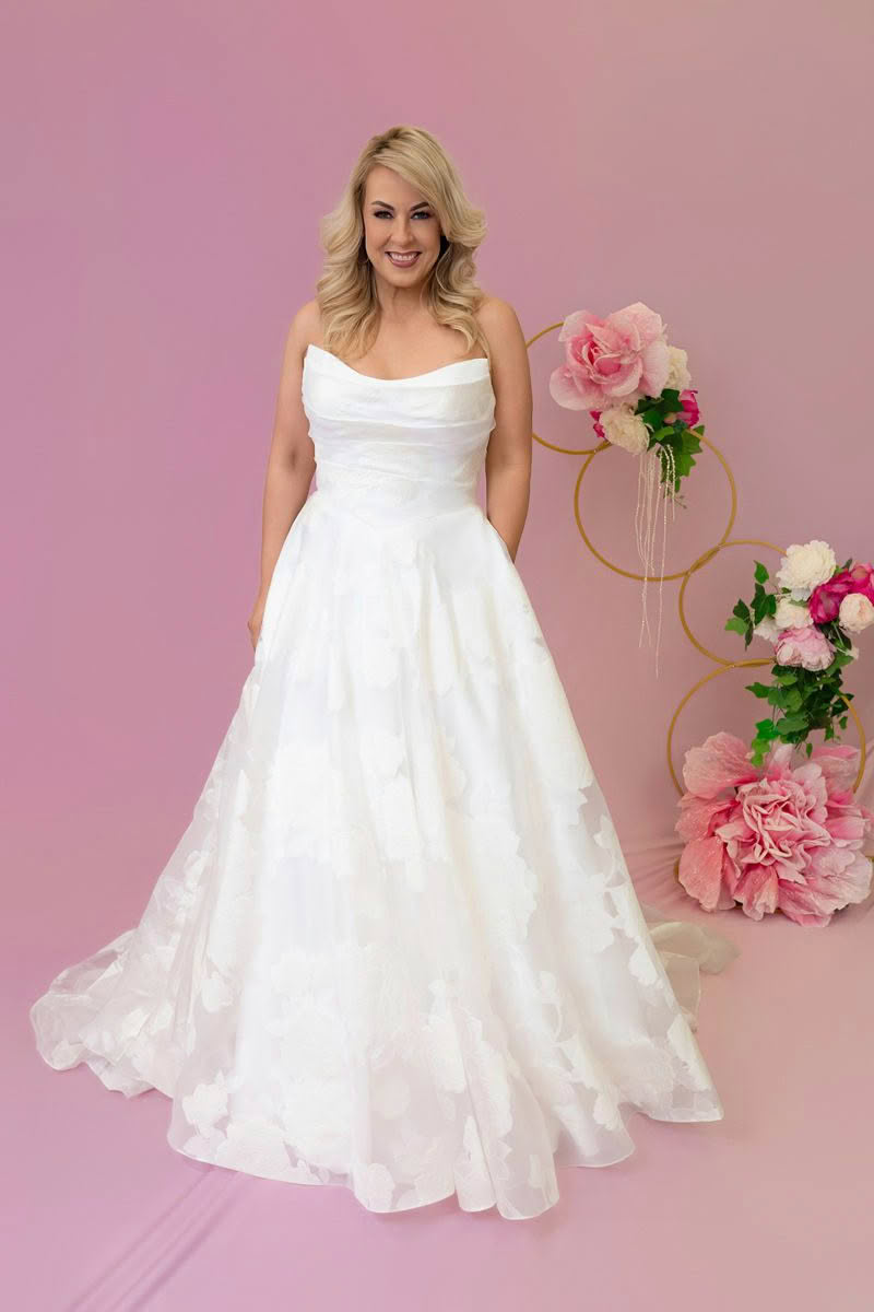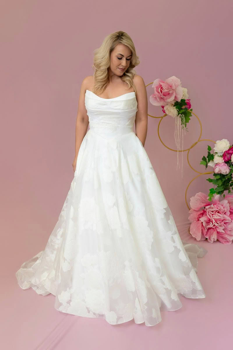Della is a timeless ball gown designed for the bride who loves a touch of modern romance. Crafted in luxurious jacquard with subtle floral detailing, this strapless gown features a soft sweetheart neckline and a beautifully structured bodice that flows into a full skirt. With hidden pockets for a playful yet practical detail, Della offers both elegance and ease for your big day.