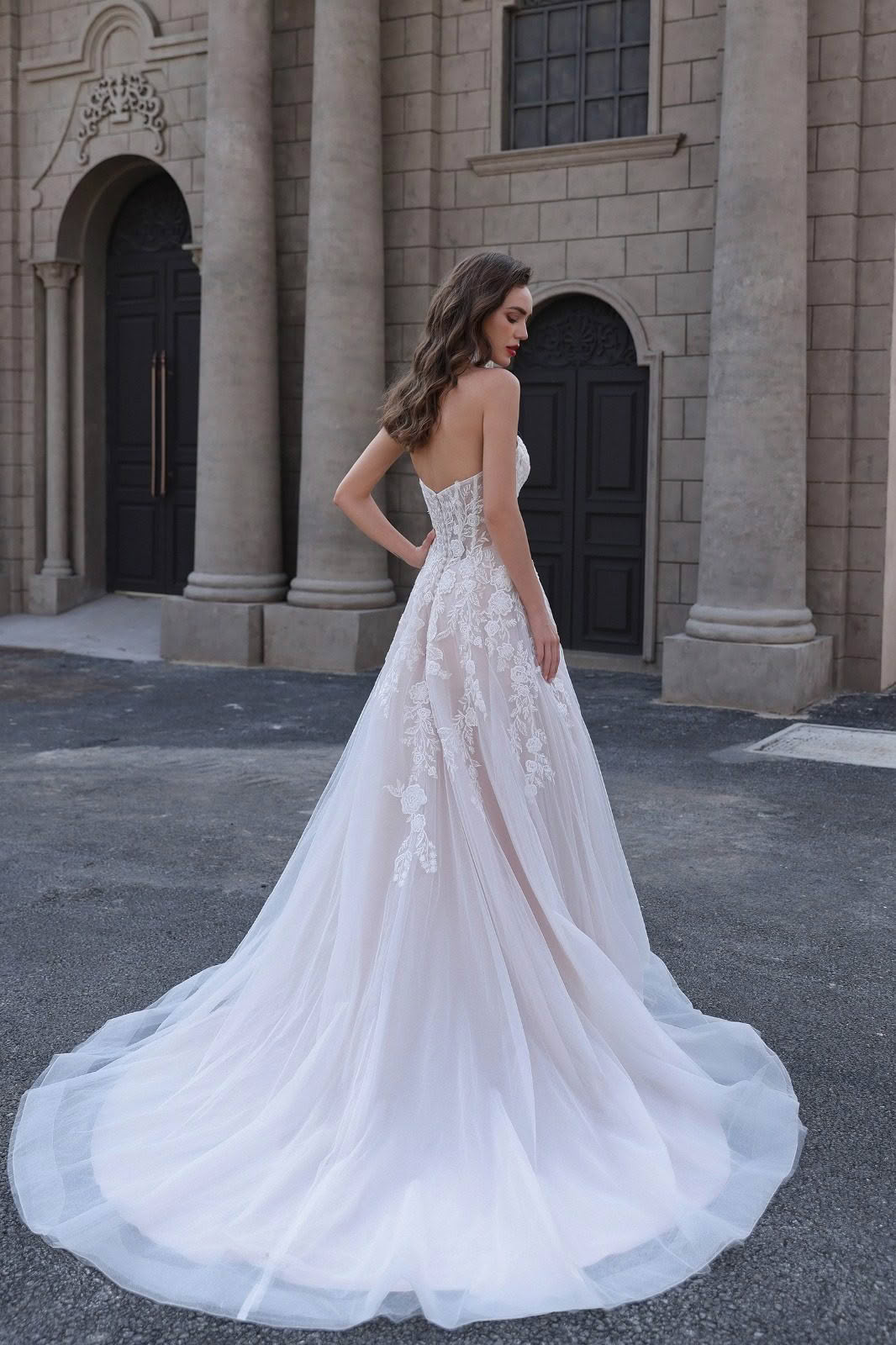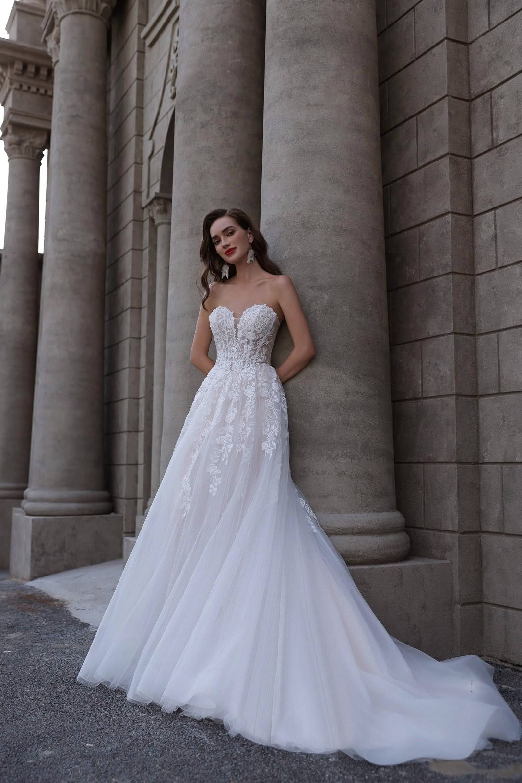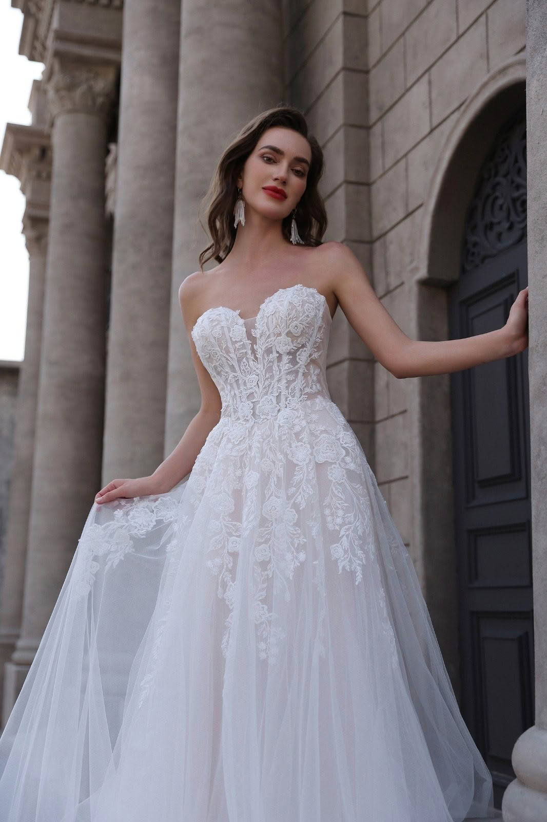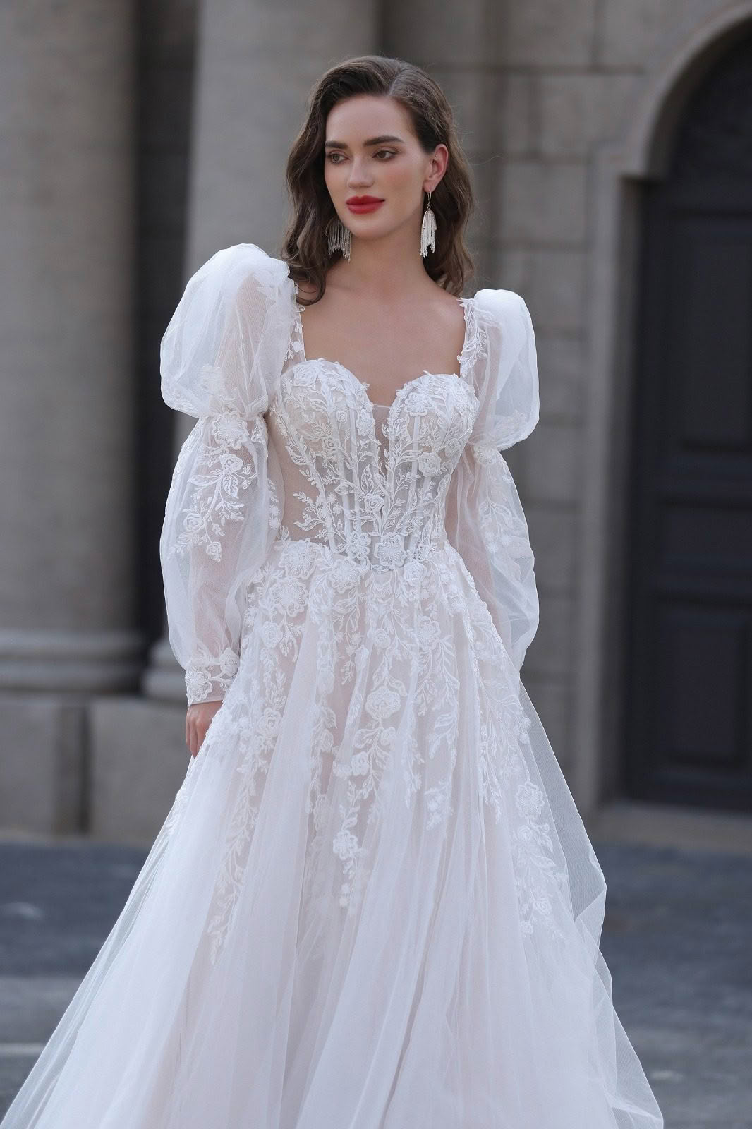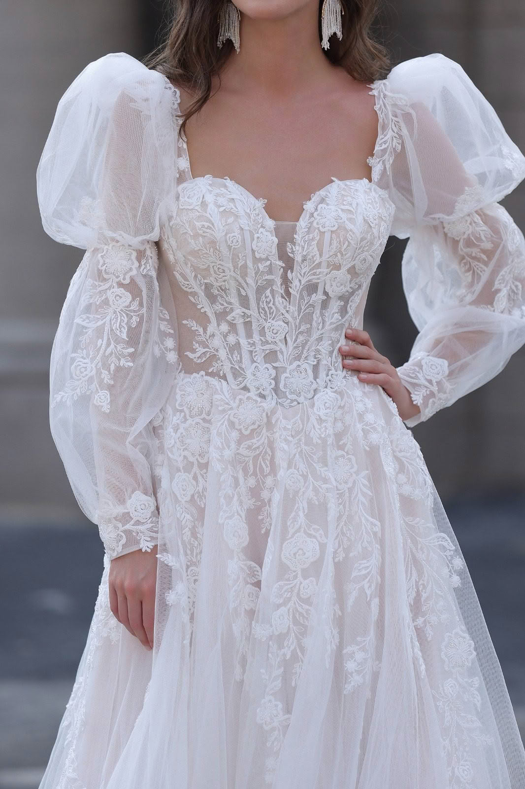 Ember effortlessly blends vintage charm with modern romance. It features dramatic puff sleeves that add a touch of grandeur and whimsy, while the sweetheart neckline enhances femininity and allure. The bodice is adorned with intricate floral lace, creating a delicate and romantic look, and sheer detailing adds a hint of sophistication. Flowing tulle skirts cascade elegantly to the floor, forming a beautiful train that exudes grace with every step. Perfect for brides who desire a timeless yet dreamy bridal style, this dress is sure to make a memorable statement on the big day.