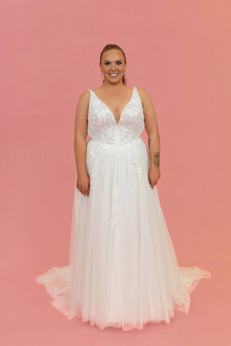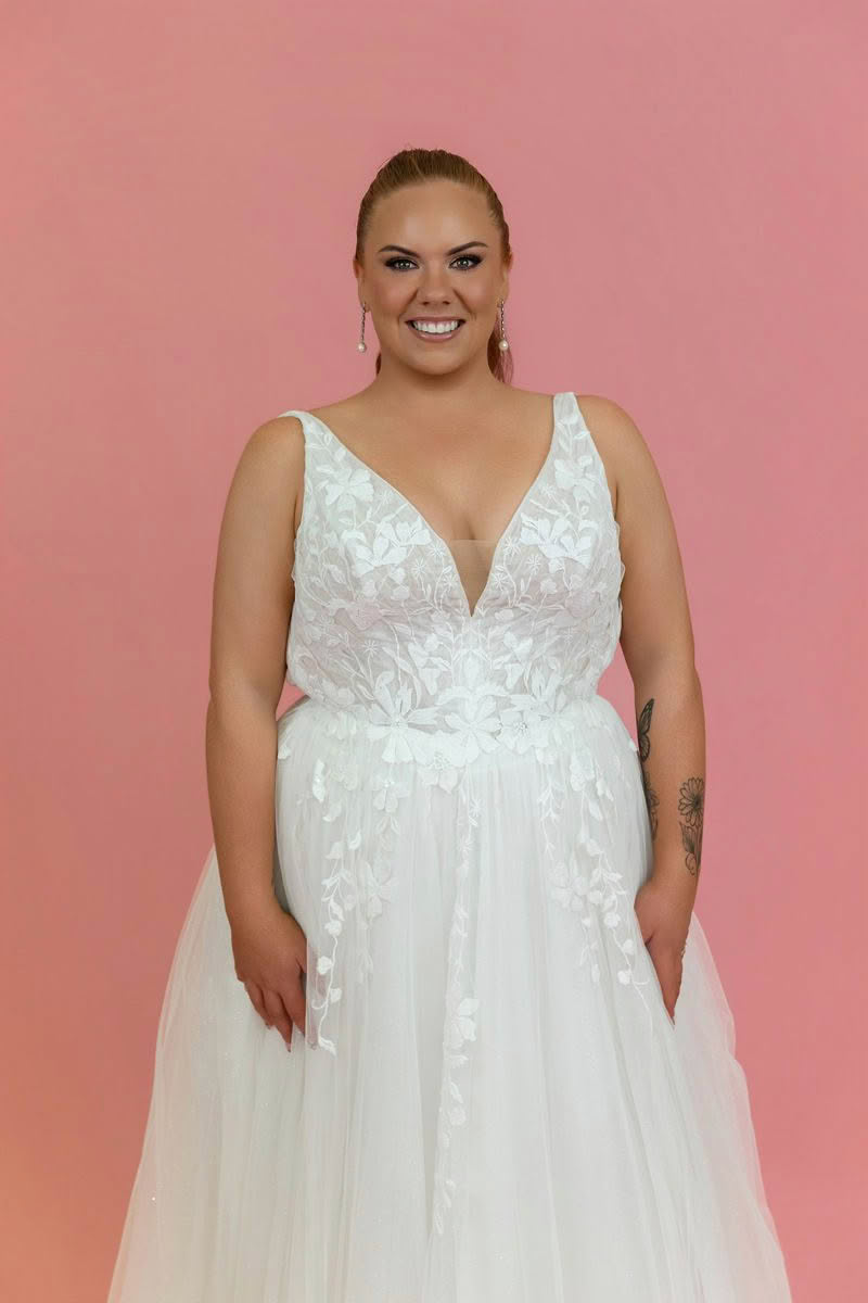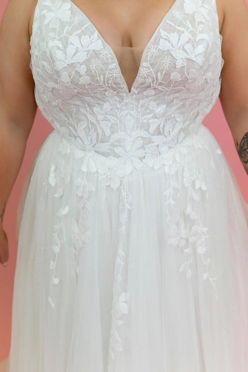 Romantic, soft and beautifully flattering, this dreamy A-line wedding dress is designed to celebrate every curve. The bodice features delicate floral lace appliqué over a sheer illusion base, creating a feminine V-neckline with subtle structure and support.