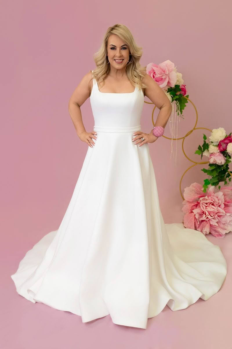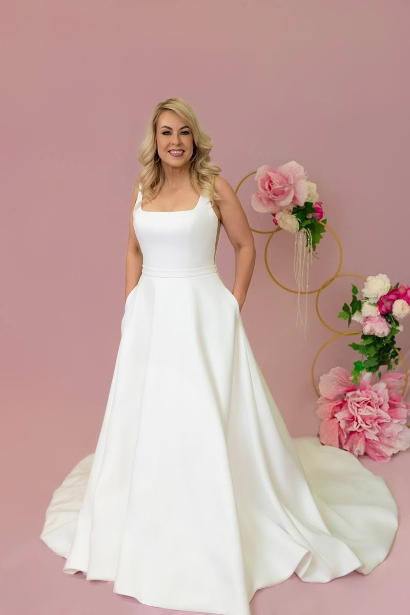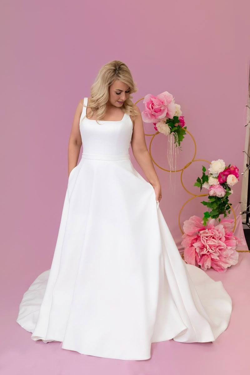 Meet Fern, a sleek and elegant wedding dress fit for the fashion-forward bride. Chic shoulder straps meet a glamorous square neckline and flawlessly-fitted bodice for a clean and minimalist bridal look of luxe satin. In the back, a scooped back detail adds to the sleek aesthetic and introduces a row of fabric-covered buttons that extend to the hem of the cathedral train. Minimalist glamour reigns in this modern A-line wedding dress.