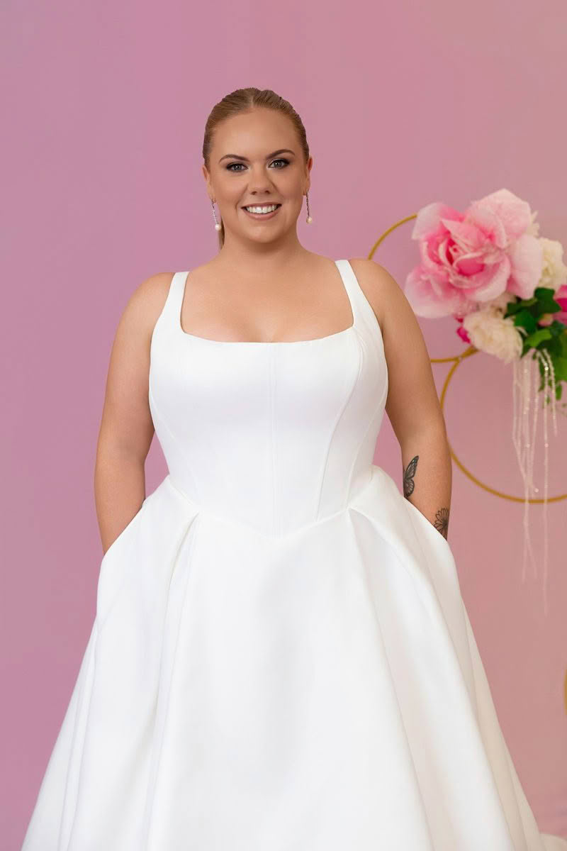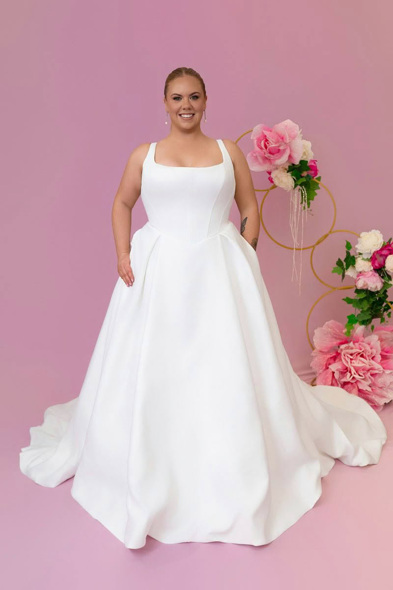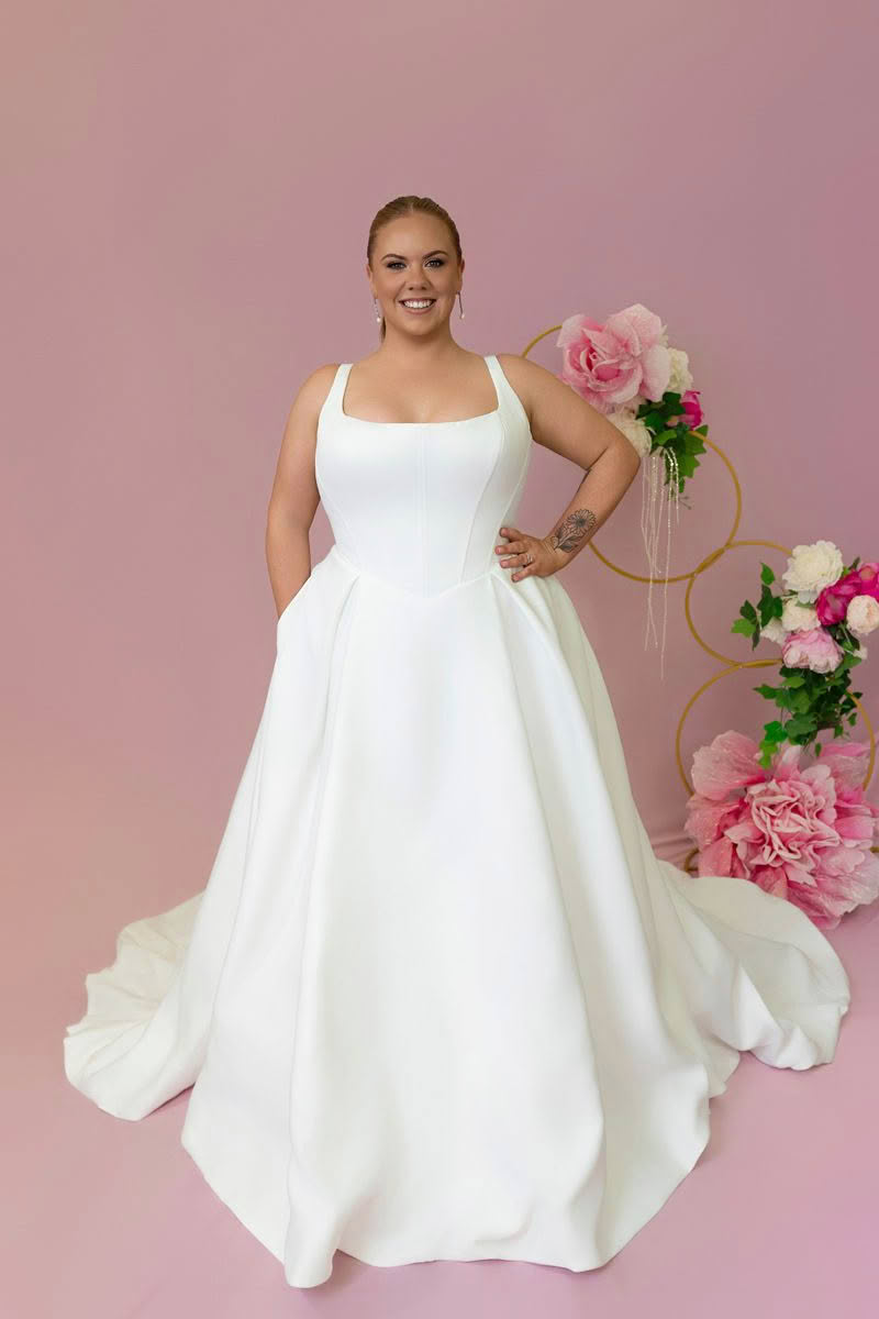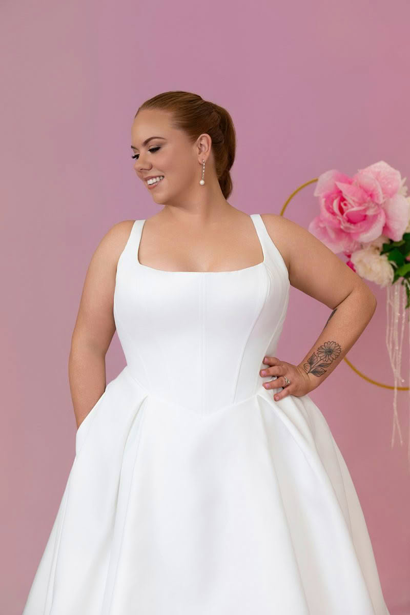 Ivy is classic bridal beauty at its finest. Featuring a structured square neckline and fitted bodice, this gown flows into a full ball gown skirt with hidden pockets for a modern twist. Elegant, sophisticated, and effortlessly regal, Ivy is made for the bride who wants a fairytale moment.