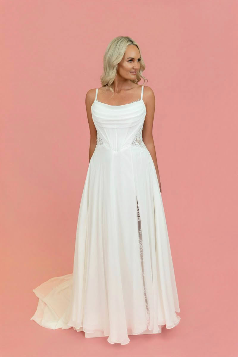 Luca Rose is soft, romantic, and effortlessly modern. This chiffon A-line features a draped cowl neckline with off-shoulder swags, delicate beaded lace side panels, and a feminine thigh split trimmed with floral lace. Floaty, flattering, and easy to wear.
