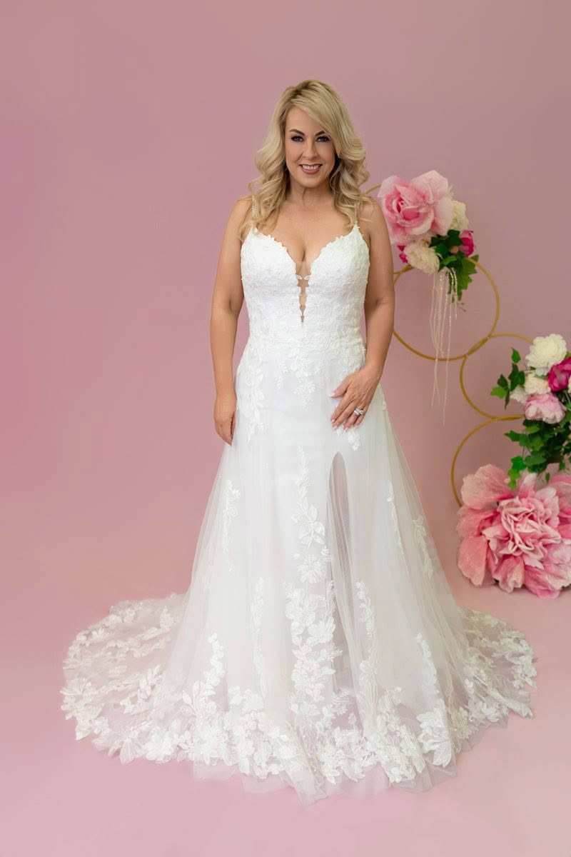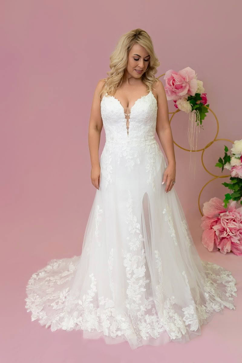 Luna is a romantic lace bridal gown featuring a figure-hugging underlay and a flowing A-line overskirt for the perfect blend of shape and softness. The deep illusion V-neckline and delicate floral appliqués trail through the skirt and hem, creating a dreamy layered effect. This design flatters every curve while adding gentle movement, the perfect gown for the bride who wants both structure and ethereal elegance.