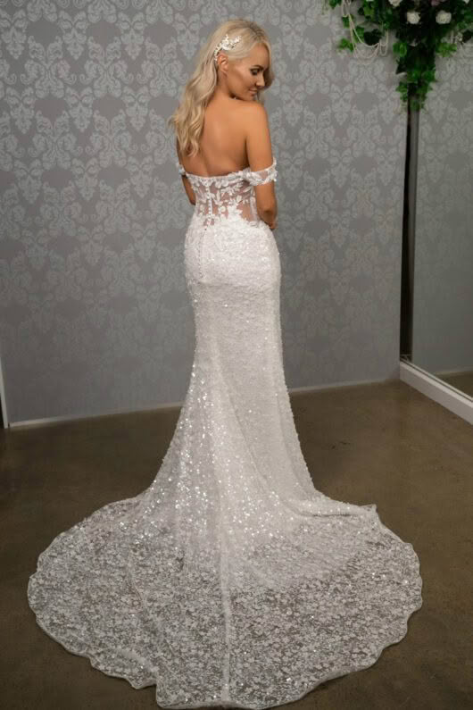 For the bride who isn’t a fan of lace but still wants to shine with glamour and sophistication, the Maddison wedding dress is the perfect choice. This stunning gown is fully adorned with sequins from top to bottom, creating a dazzling effect that catches the light with every step. The subtle sparkle adds depth and texture, giving the dress a modern, couture feel that’s both striking and effortlessly elegant.