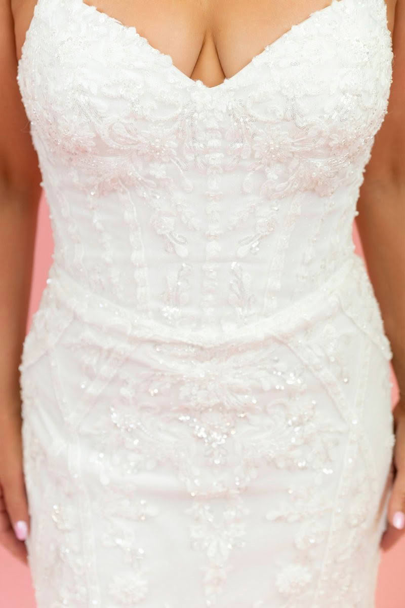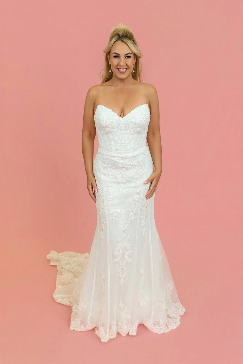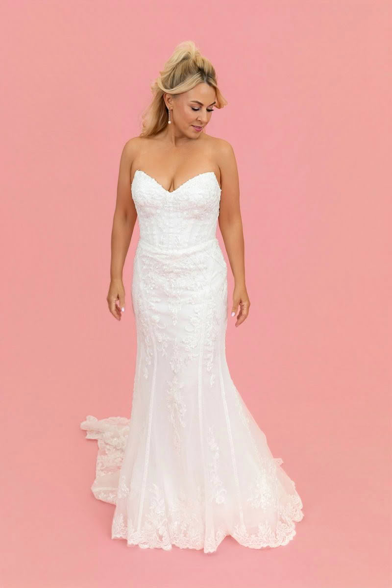 Monroe is the definition of modern romance. This stunning strapless wedding dress features a beautifully structured bodice adorned with intricate lace appliqué and delicate beading that catches the light with every movement. The softly sculpted sweetheart neckline enhances the décolletage while the corset-inspired bodice creates a flattering, contoured silhouette.