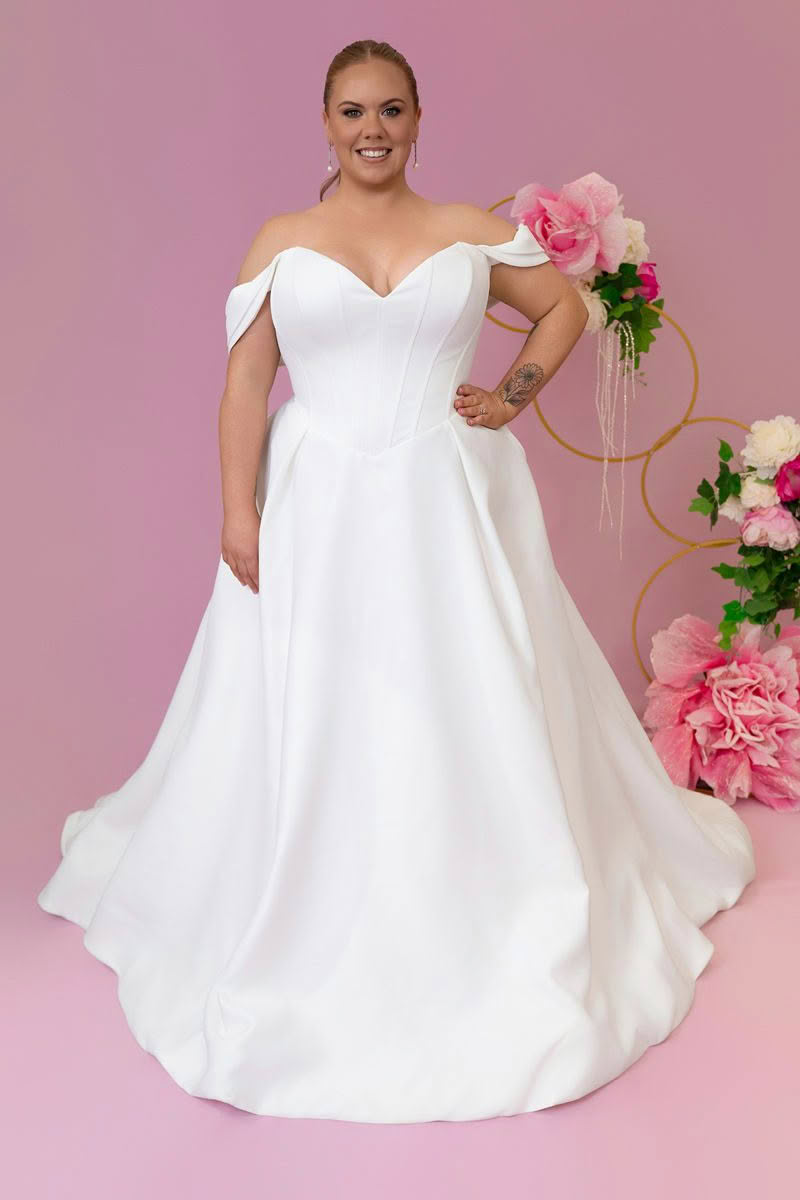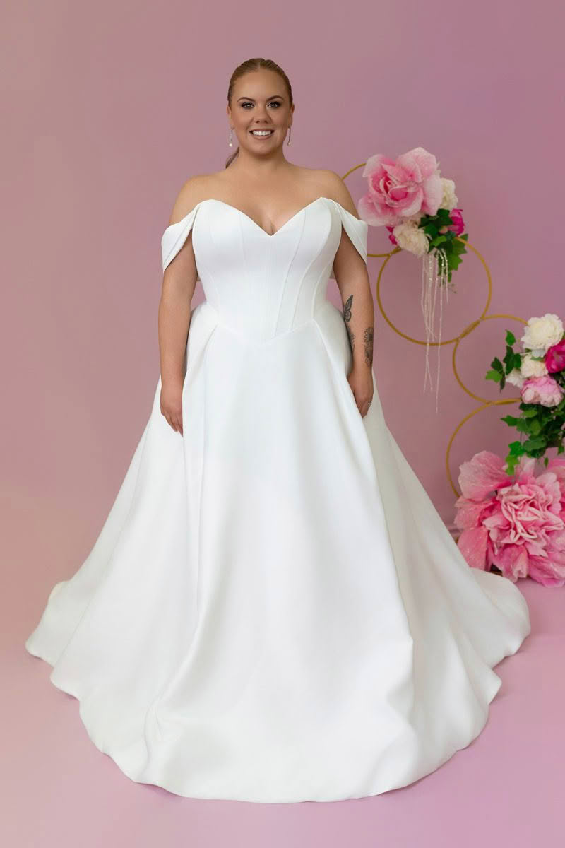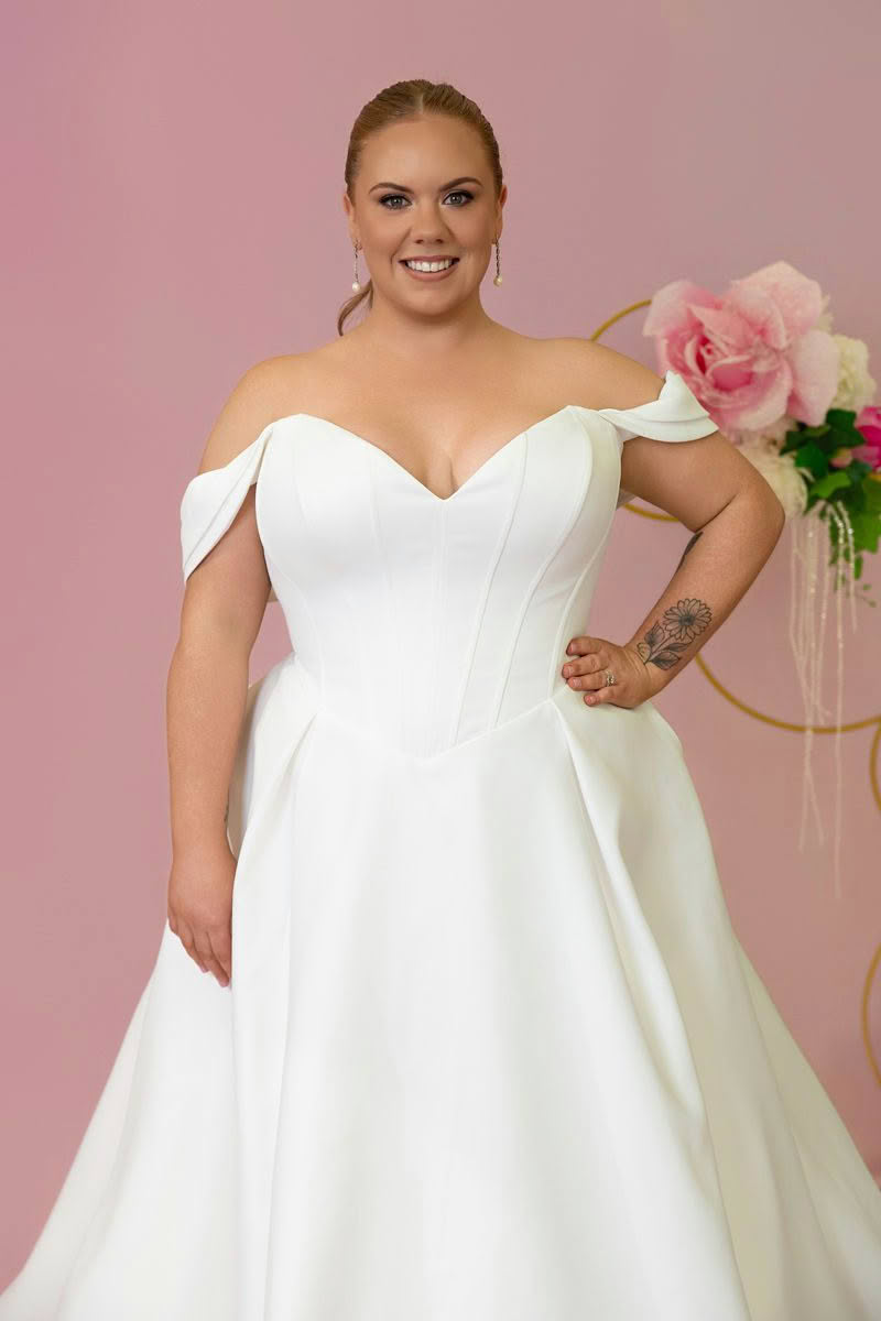 The Nadine gown is all about timeless grandeur. With an off-the-shoulder neckline, a corset-inspired bodice, and a dramatic satin ballgown skirt, this dress embodies sophistication. Perfect for brides seeking a regal and classic look, Nadine ensures a striking entrance and a truly unforgettable bridal moment.