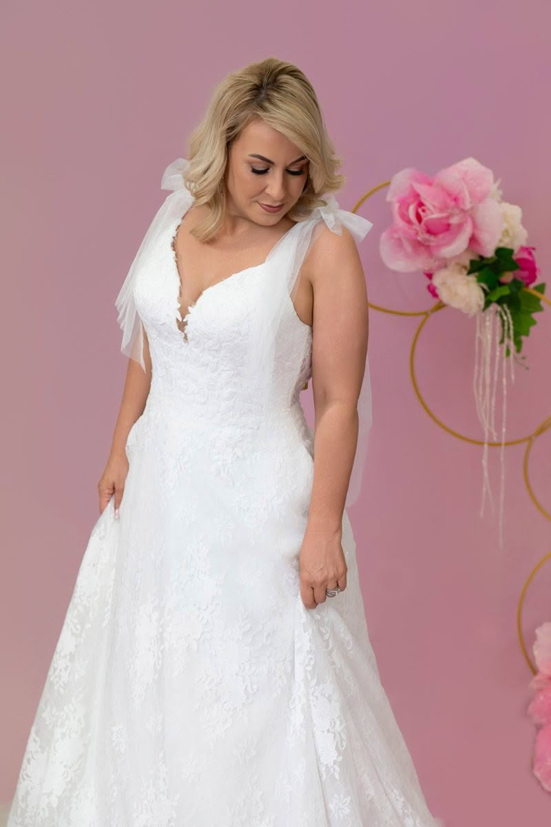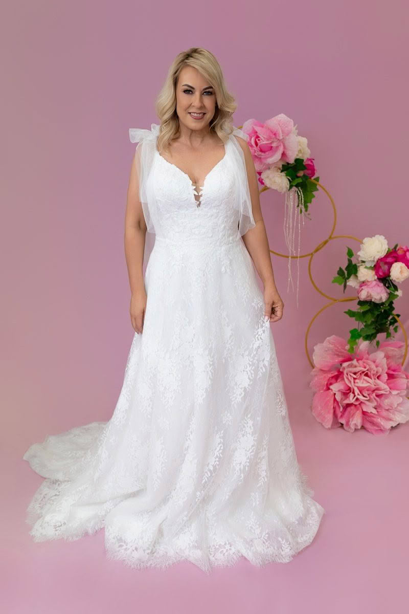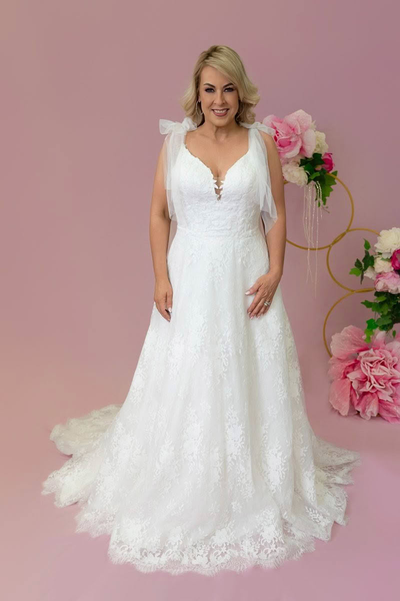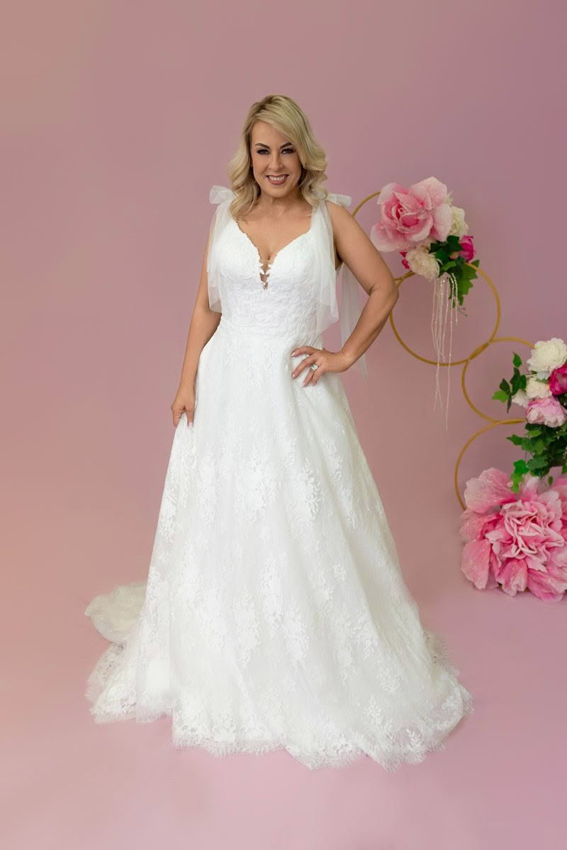 Raine is soft, feminine, and effortlessly romantic. Crafted in allover lace, this gown features a flattering plunging neckline and delicate bow tie straps for a touch of whimsy. The flowing A-line skirt is finished with a scalloped hem and sweeping train, making Raine perfect for brides who want both charm and timeless elegance