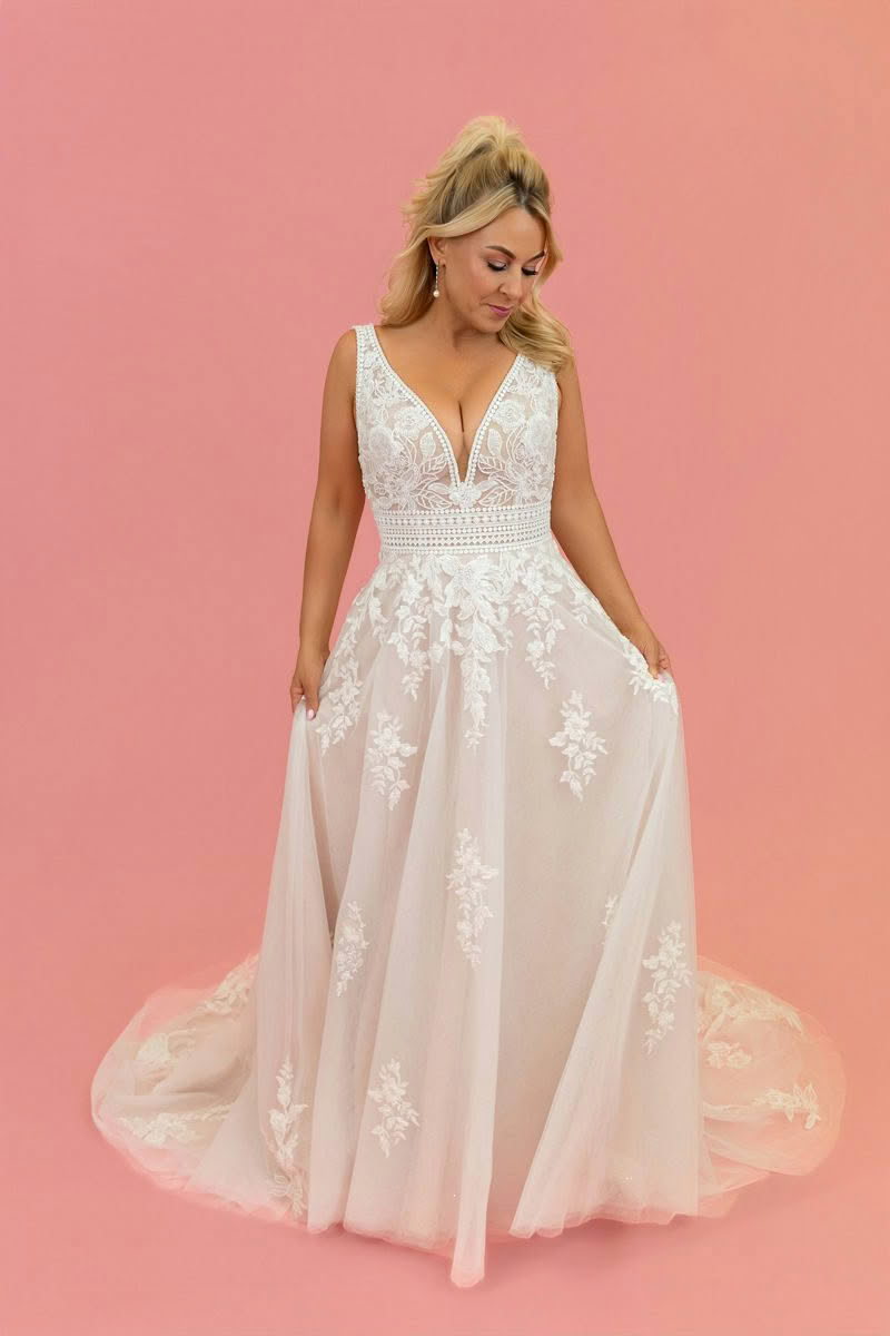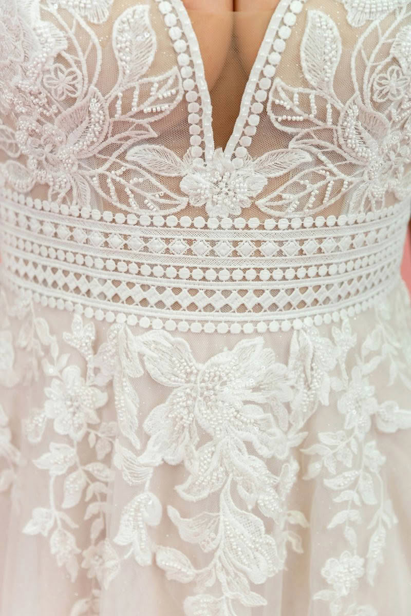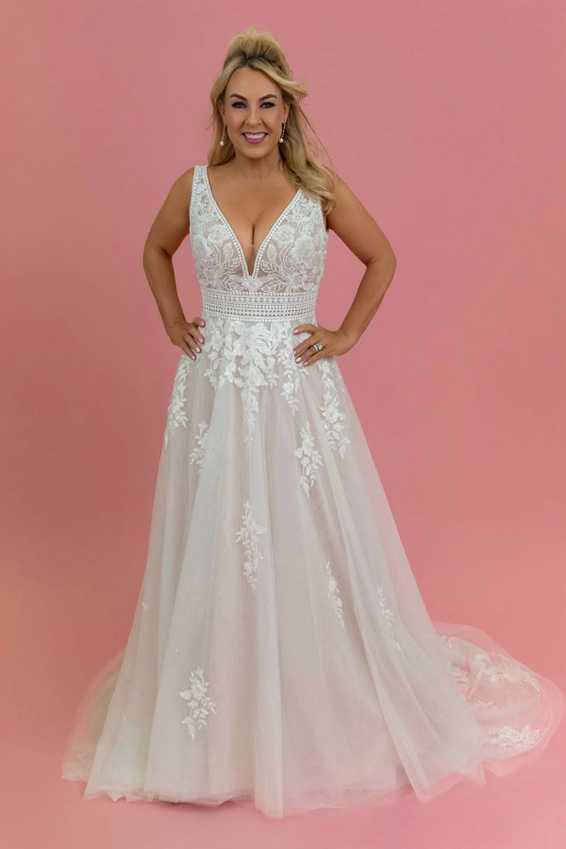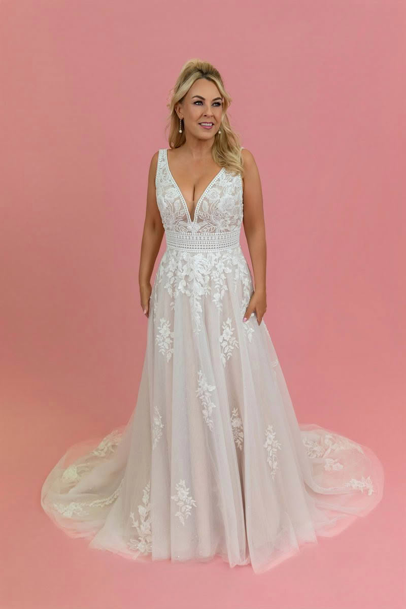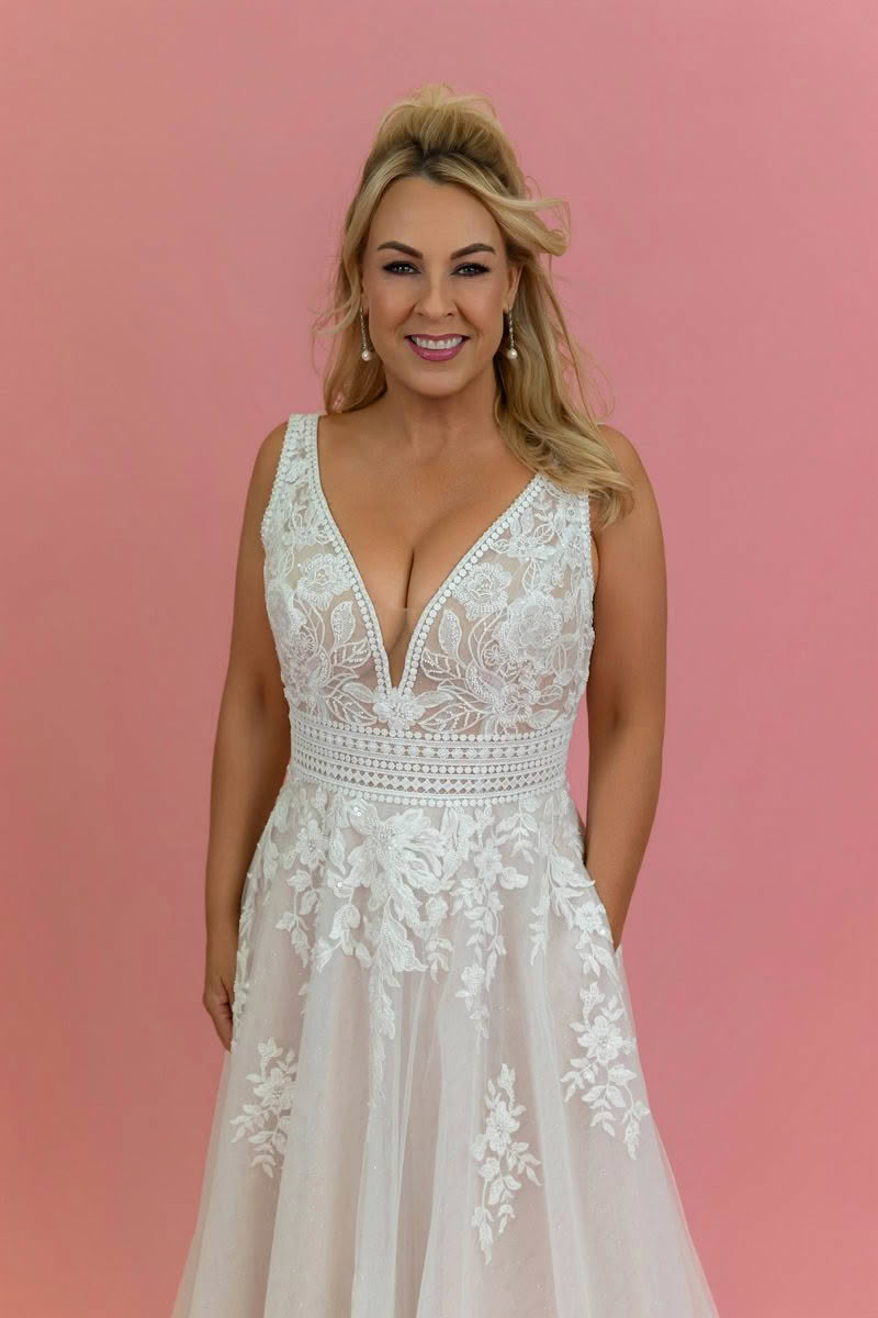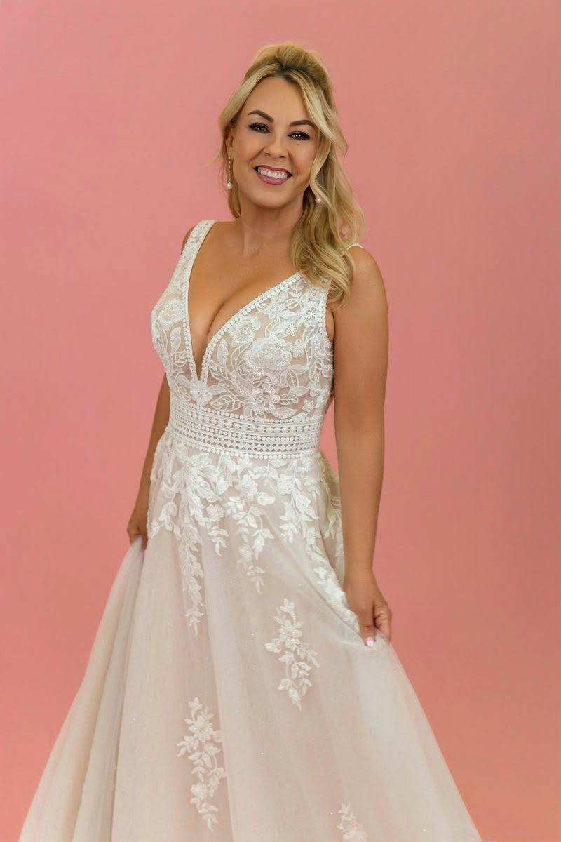 Rose Mist is a beautifully romantic wedding dress that blends timeless lace with soft, modern elegance. The gown features a flattering deep V neckline and delicate illusion lace bodice that highlights the décolletage while offering graceful support through wide lace straps.