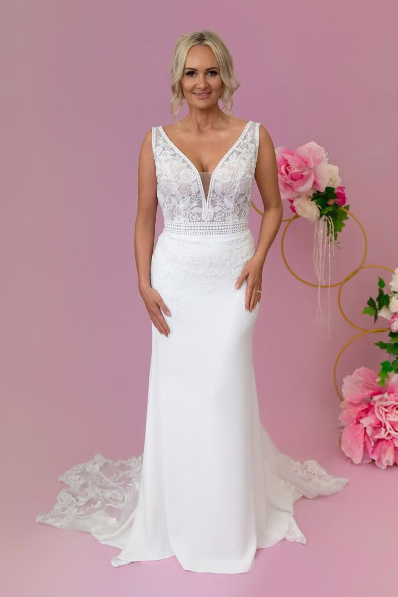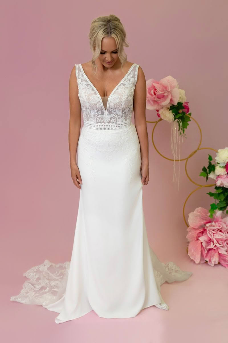 Snowdrop is a stunning combination of modern simplicity and romantic detail. The plunging lace bodice with intricate embroidery meets a sleek crepe skirt that skims the figure beautifully. Finished with a dramatic lace train, Snowdrop is perfect for the bride who wants elegance with a touch of drama.