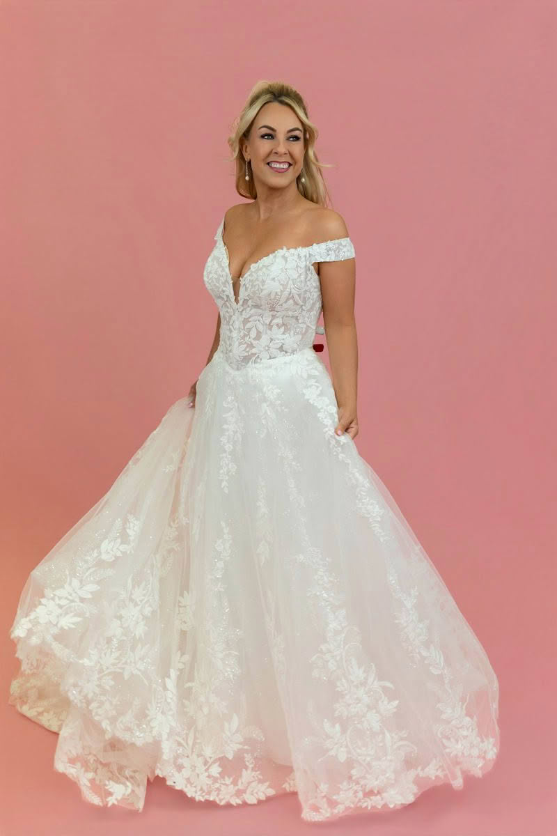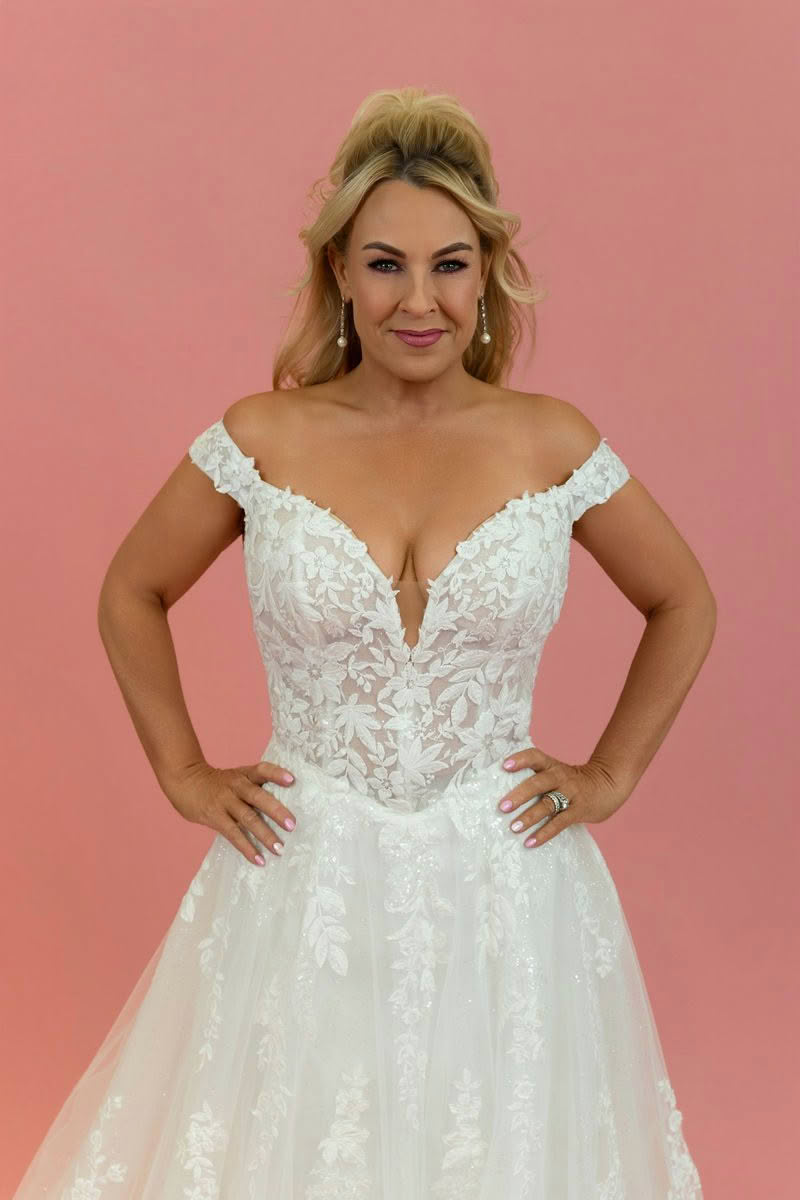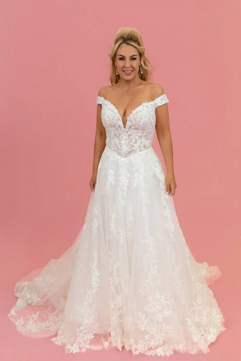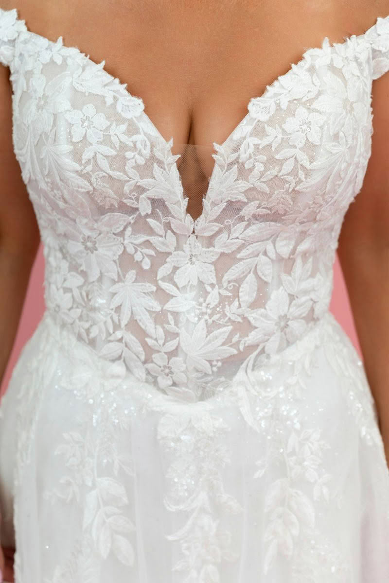 Starlit Grace is a romantic off-the-shoulder lace wedding dress designed for brides who want timeless elegance with soft modern sparkle. The gown features a beautifully detailed illusion lace bodice with delicate floral appliqué that creates a feminine and sculpted silhouette.