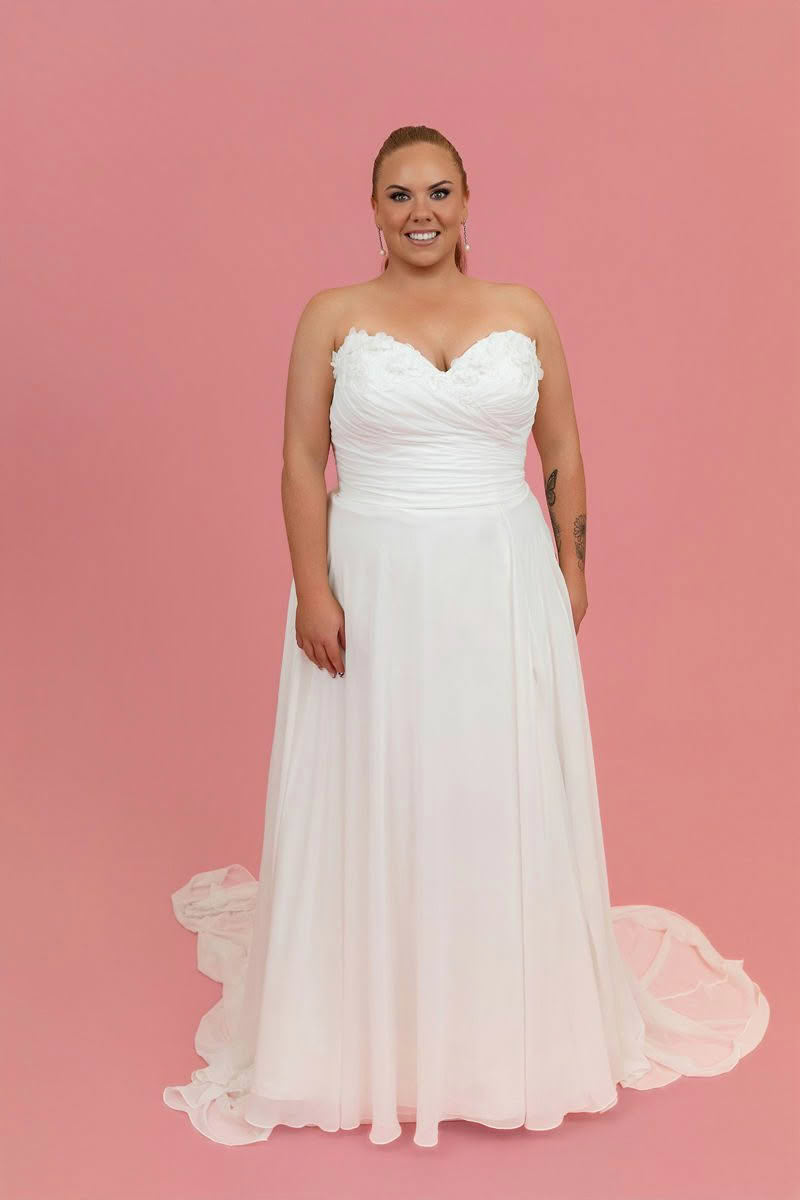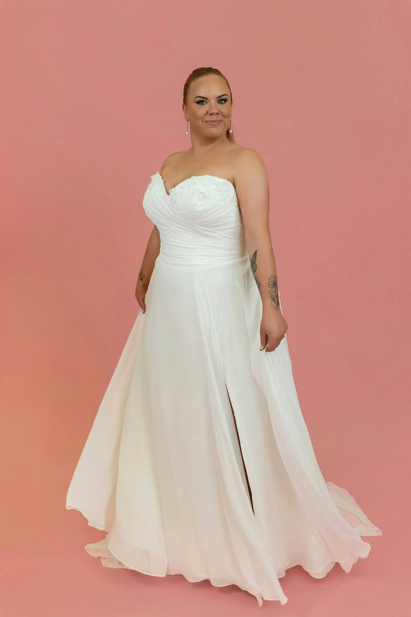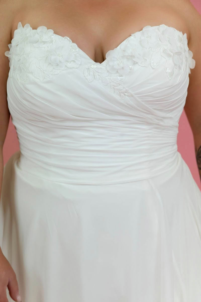 A breathtaking blend of romance and sophistication, this strapless wedding dress is designed for the bride who loves effortless elegance. Style SY8145 floats down the aisle in a soft A-line silhouette, adorned with delicate chiffon floral appliqus for a dreamy, ethereal effect. The ruched chiffon bodice features a captivating 3D floral neckline detail, drawing attention with its intricate yet modern design. Draped to perfection, the luxurious fabric glides over the figure, creating a goddess-like aura. From the waist, the chic skirt flows gracefully, while a tasteful leg slit adds a touch of sultry charm with every step toward forever.