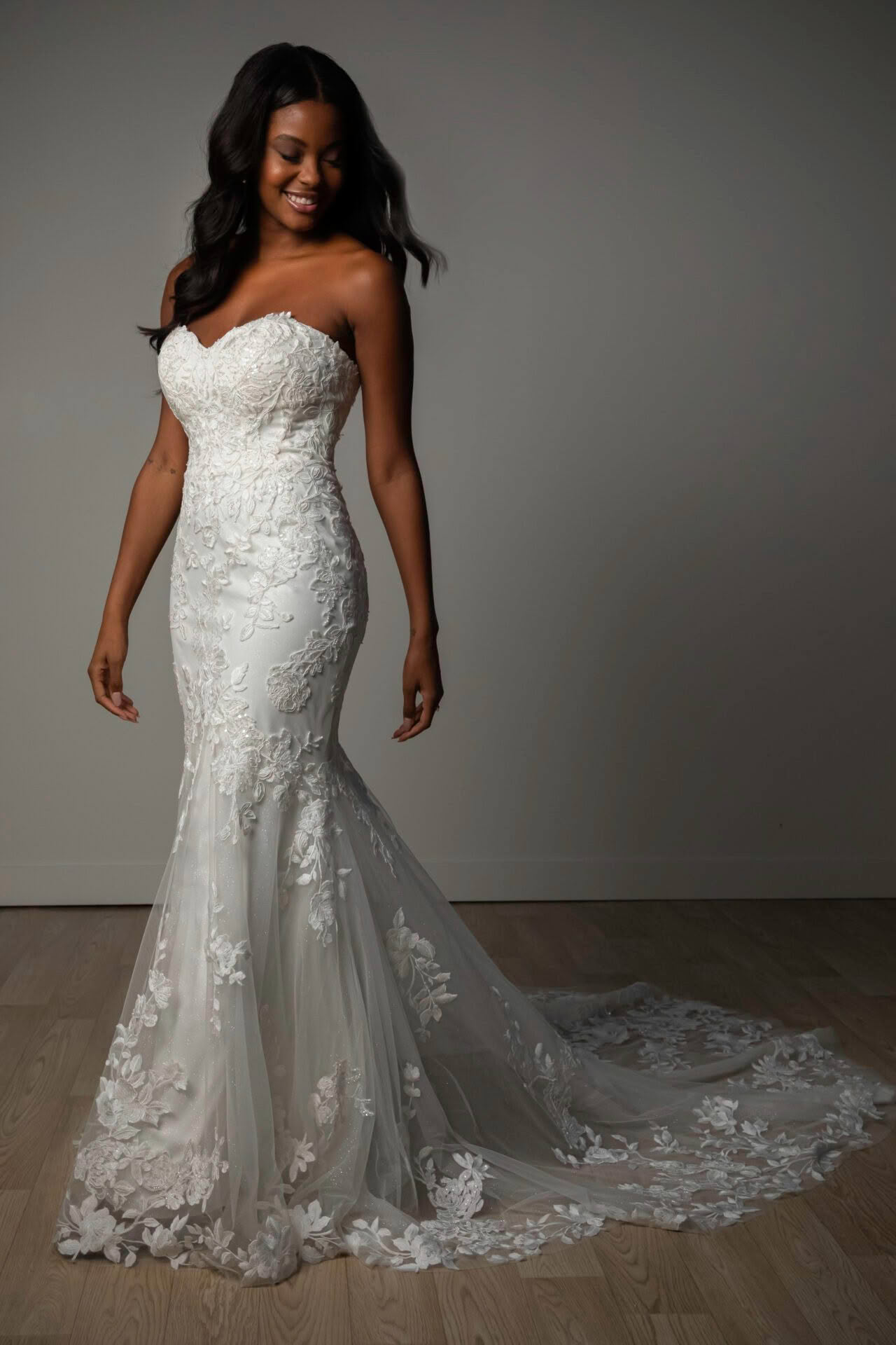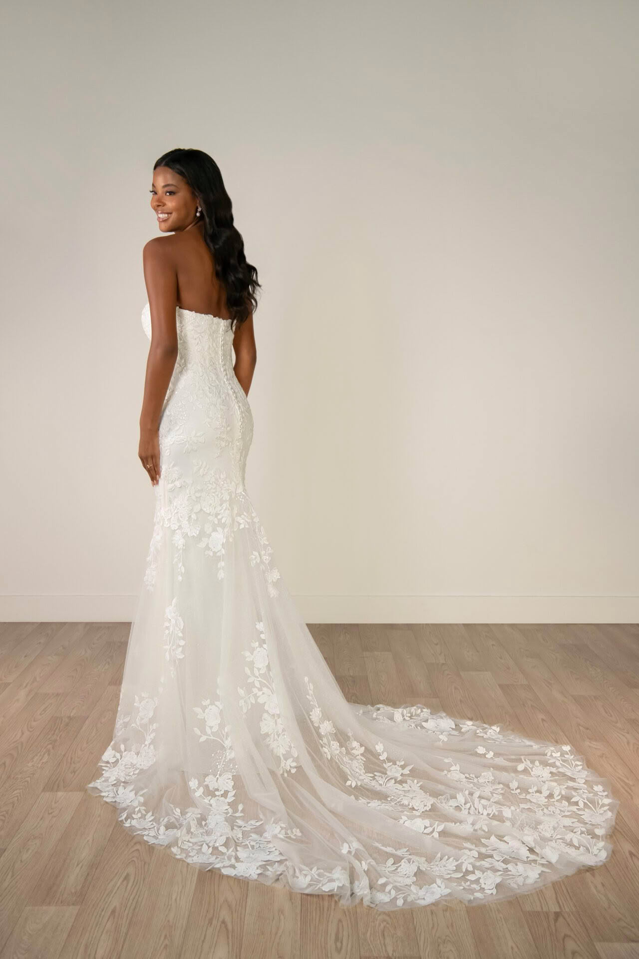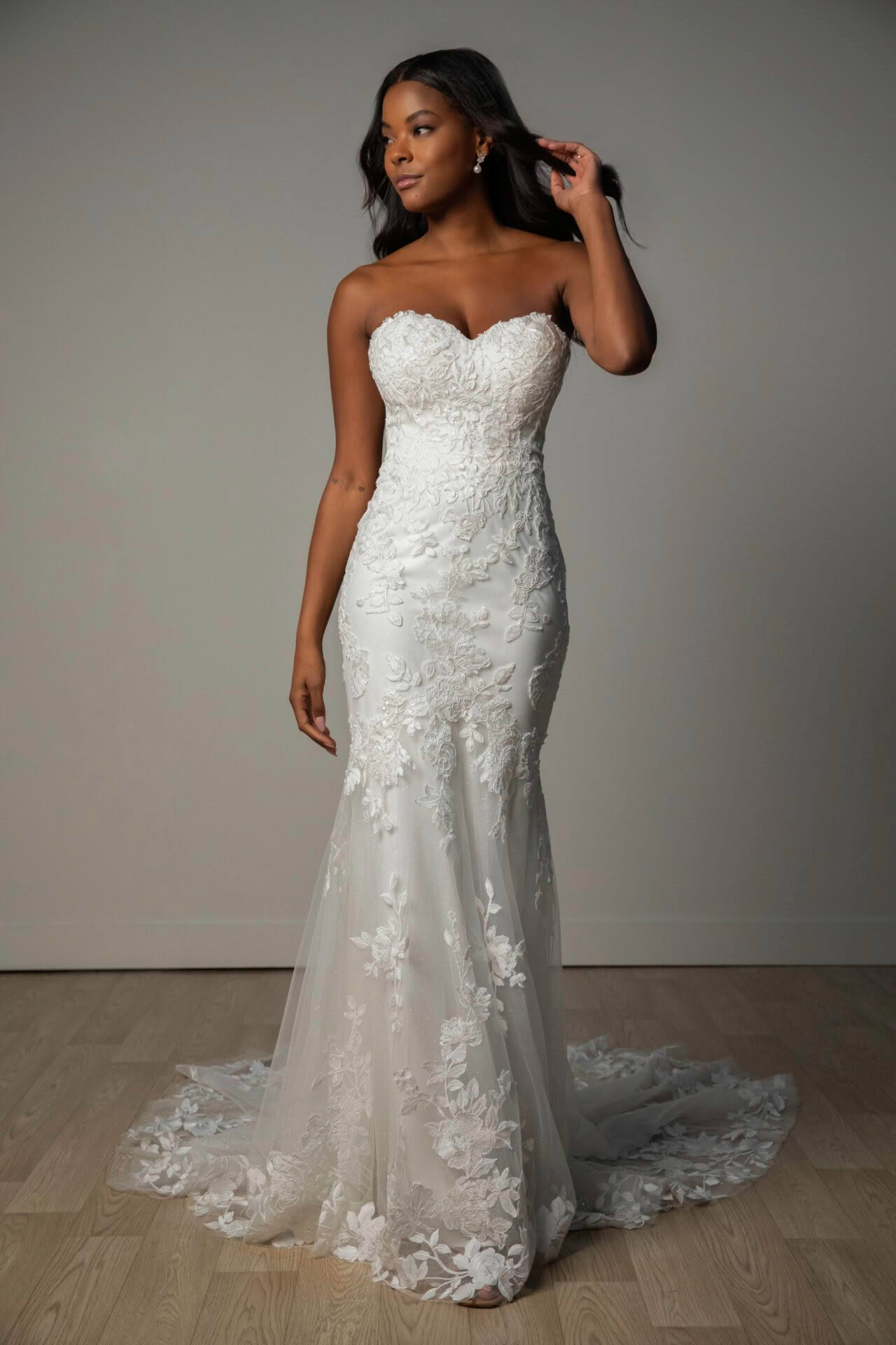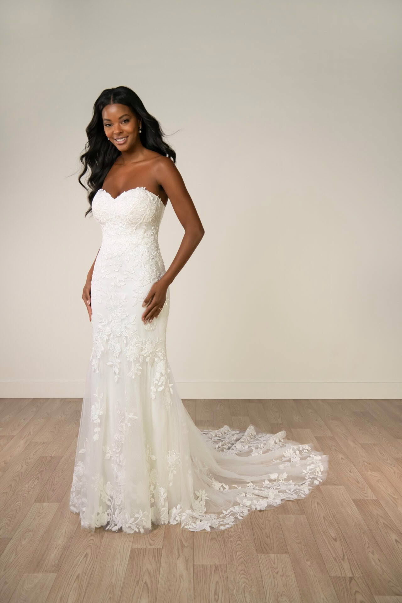 A romantic masterpiece, Style SY8332 is meticulously crafted from a blend of delicate lace and tulle, offering a sophisticated trumpet profile that celebrates the natural form. The strapless sweetheart bodice is adorned with intricate floral lace and elevated by shimmering beading, which sits atop a glitter tulle or tulle underlay for a multi-dimensional glow. Elegantly finished with a classic zip-up closure accented by fabric buttons that lead into a stunning, lace-detailed train.