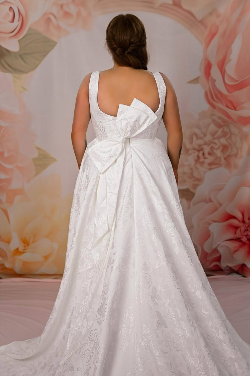 Introducing Tammie—a wedding dress that perfectly blends modern style with timeless elegance. Crafted from luxurious Jacquard fabric, Tammie is as soft as it is stunning, offering a comfortable yet sophisticated feel throughout your special day. The on-trend square neckline adds a touch of architectural elegance, while remaining flattering and balanced, drawing attention to your shoulders and collarbones.