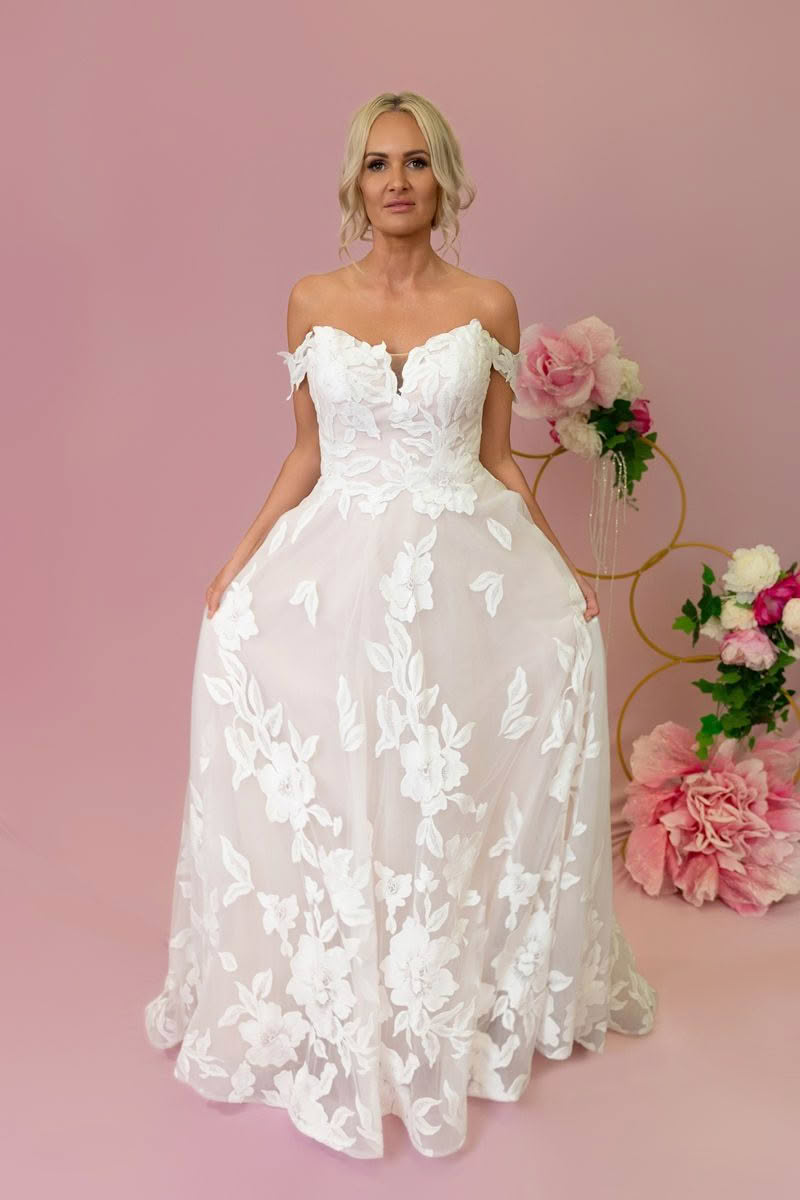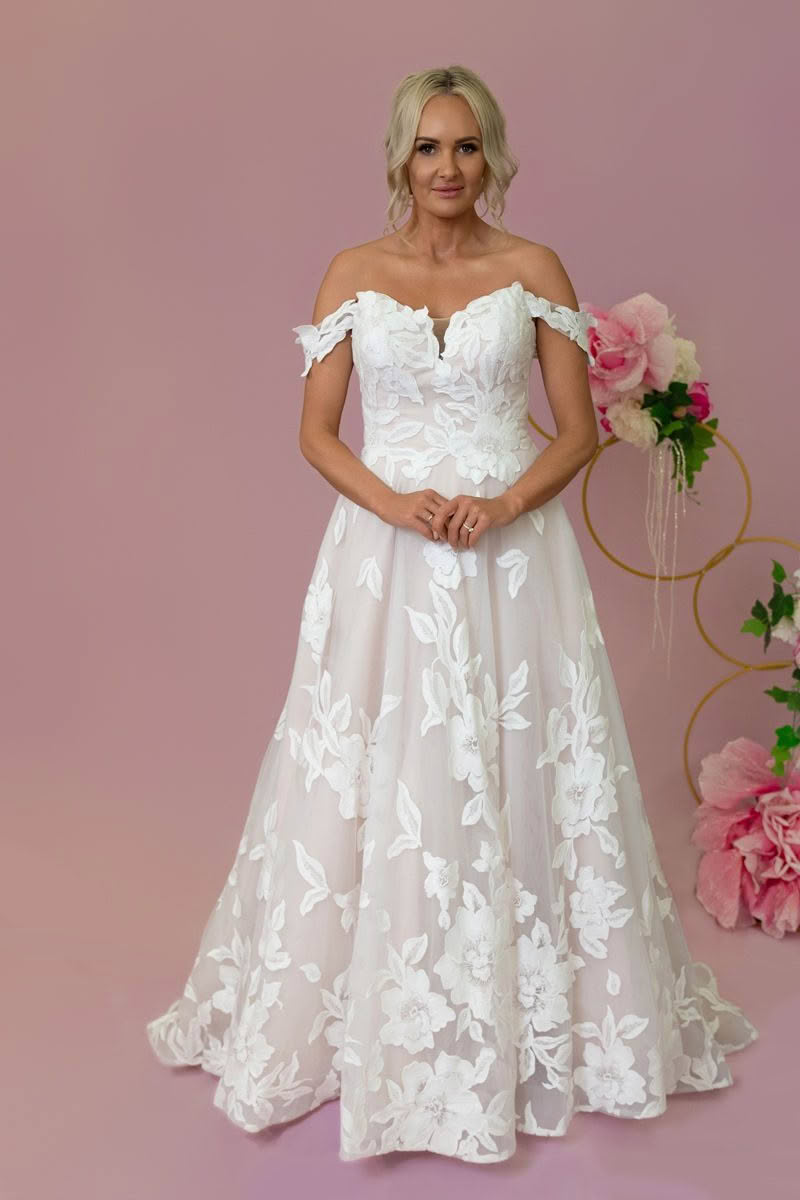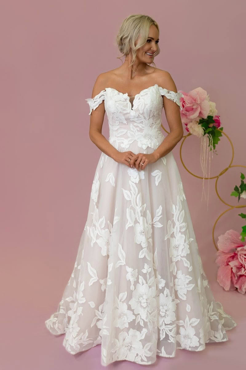 Topaz is pure romance. Featuring an off-the-shoulder neckline with delicate lace appliqué that trails seamlessly into the skirt, this A-line gown is both flattering and feminine. The structured bodice balances the soft movement of the skirt, making it perfect for brides wanting a dreamy, ethereal feel with a modern twist