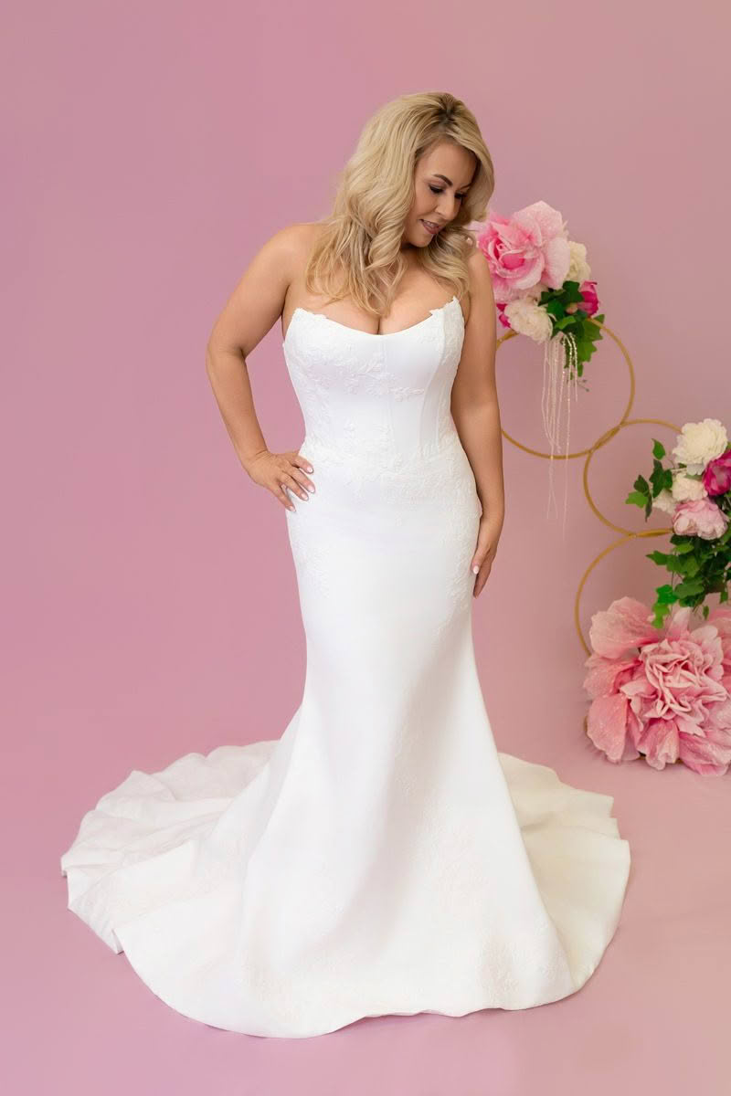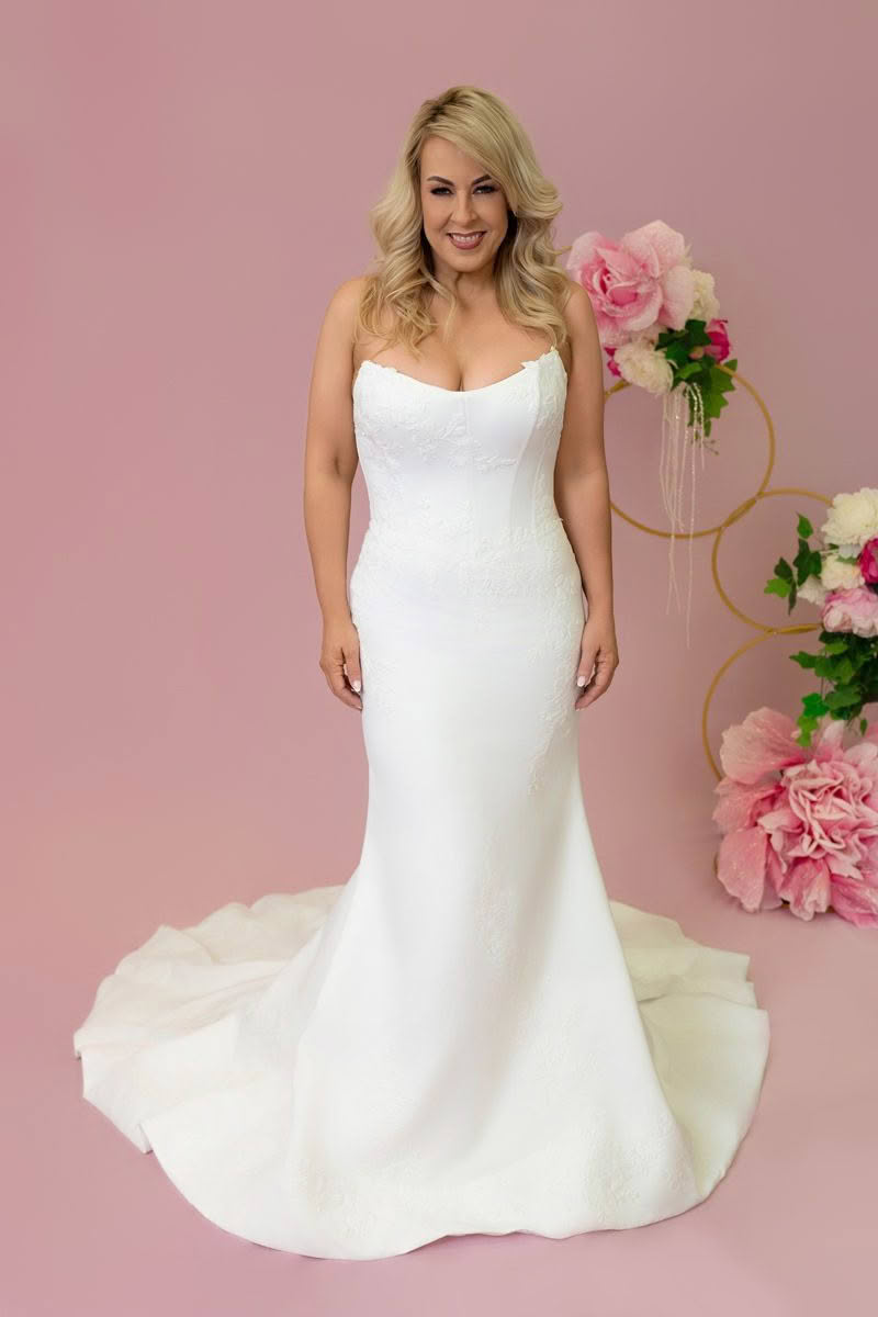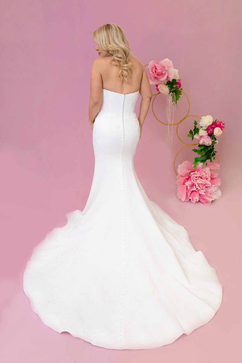 Valencia is all about structured beauty. With a sweetheart neckline and corset-inspired bodice, this strapless gown offers figure-enhancing structure while soft lace detailing adds a romantic finish. The fitted design flows effortlessly into a dramatic train, perfect for brides who love timeless elegance with a modern edge.